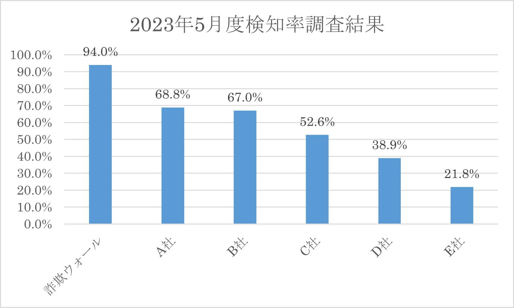 詐欺ウォールを開発・提供するBBソフトサービスでは、公的機関などとの連携によって収集した詐欺サイトURLを利用し、定期的に詐欺サイトの検知率調査を行っています。2023年5月の詐欺ウォールによる詐欺サイト検知率は96%と他社と比較し高い結果となりました。