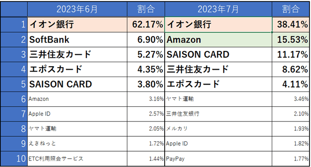 7月度は前月に引き続きイオン銀行のフィッシングサイトが1位となっていますが、実数ベースでは3分の1まで減少しています。Amazonは12ポイント増加し、実数ベースでも2倍以上となっています。