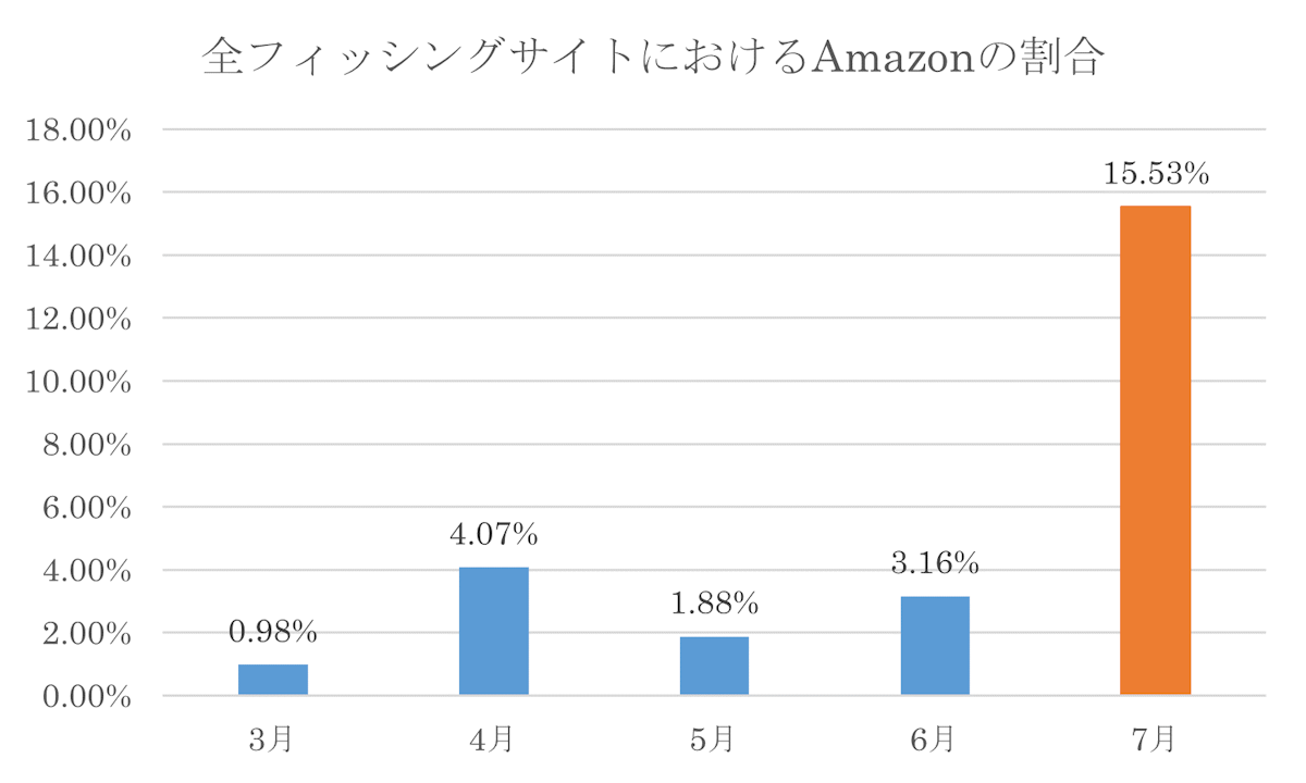 7月度はAmazonのフィッシングサイトが構成比と実数とも急増しました。実数べースでは2倍以上に増加、全フィッシングサイトの中で15%の割合を占め、7月11日から始まったプライムデーに便乗した可能性もあります。Amazonのフィッシング詐欺は「会員の満期通知」「お支払い方法の更新」「受取スポット」など様々な切り口で情報を詐取する手口が横行しており、注意が必要です。
