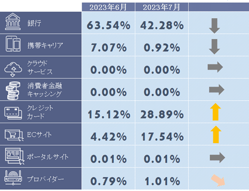 7月度は、銀行のカテゴリが20ポイント以上減少しており、イオン銀行の報告数が減少したことが影響しています。また例年夏にクレジットカードのフィッシング詐欺が増加傾向にありますが、実数・構成比とも増加しており、注意が必要です。
