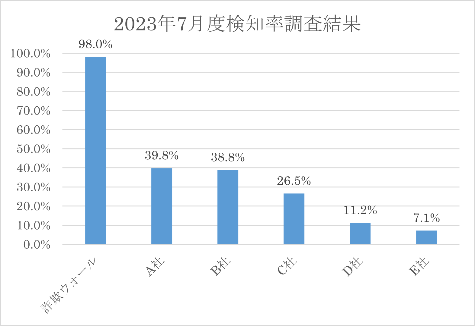 詐欺ウォールを開発・提供するBBソフトサービスでは、公的機関などとの連携によって収集した詐欺サイトURLを利用し、定期的に詐欺サイトの検知率調査を行っています。2023年7月の詐欺ウォールによる詐欺サイト検知率は98%と他社と比較し高い結果となりました。