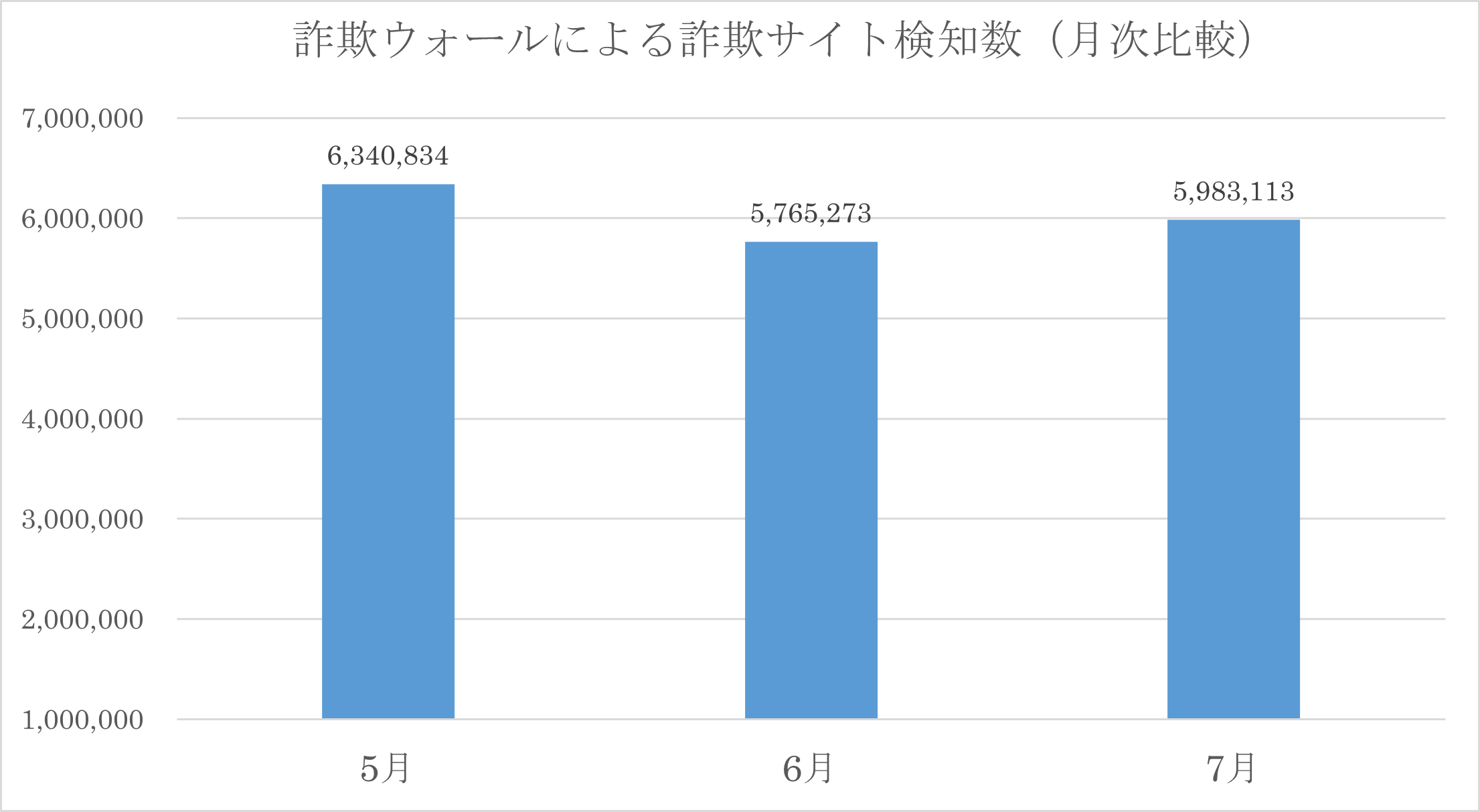 2023年7月の詐欺ウォールによる詐欺サイト検知数は5,983,113件で、2023年6月と比較すると、217,840件増加する結果となりました※。