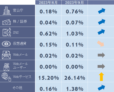 9月度は、三井住友カードの報告数が増加したことにより、クレジットカードの構成比が14ポイント増加しています。また携帯キャリアはSoftBankの報告数が増加したことにより構成比が5ポイント増加、前月「使えるくらうど見積」の影響で大きく増加したクラウドサービスは報告数が激減し18ポイント減少、一過性であった可能性があります。構成比が11ポイント増加したWebサービスは交通系サイトのフィッシングサイトが増加したことが影響しています。