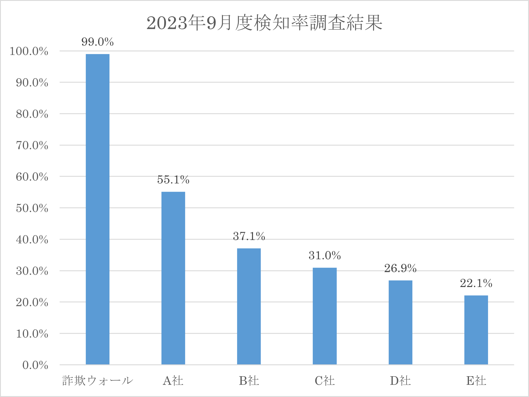 詐欺ウォールを開発・提供するBBソフトサービスでは、公的機関などとの連携によって収集した詐欺サイトURLを利用し、定期的に詐欺サイトの検知率調査を行っています。2023年9月の詐欺ウォールによる詐欺サイト検知率は99%と他社と比較し高い結果となりました。