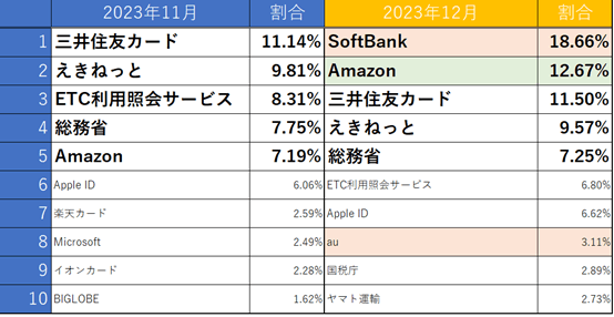 12月度はSoftBankが1位となりました。またAmazonも実数ベースで倍増しており注意が必要です。また国税庁が新しくランクインしており、今後確定申告に向けて増加する可能性があります。またランキングには入っていませんが、NHKの詐欺サイトが16倍に増加、12位にランクインしており注意が必要です。