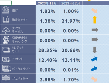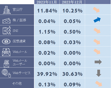 12月度はSoftBankとauのフィッシングサイトが増加した影響で、携帯キャリアカテゴリが20ポイント増加しています。官公庁カテゴリもマイナポイントの詐欺サイトの増加で構成比では減少していますが、実数では増加しており注意が必要です。