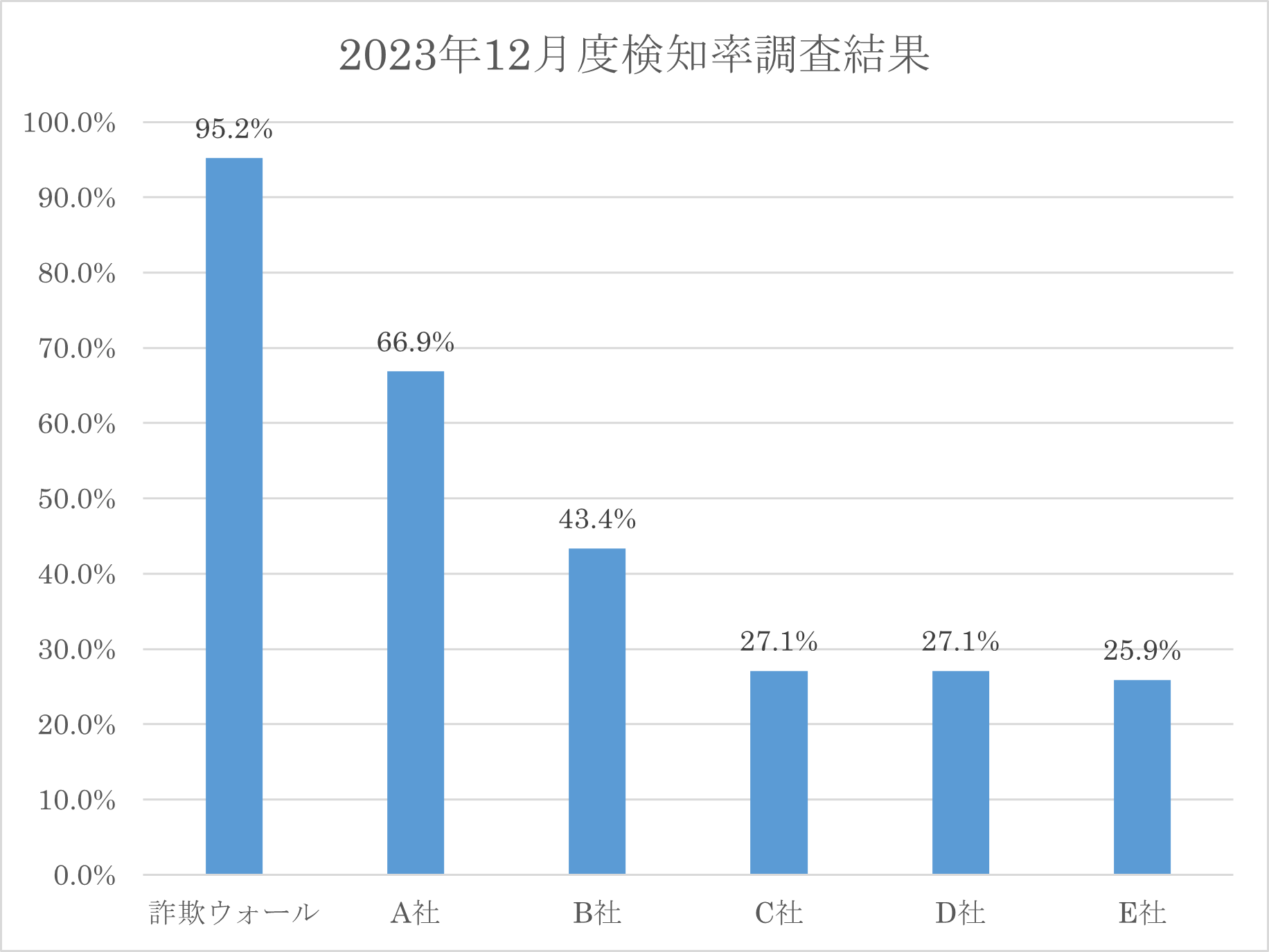 詐欺ウォールを開発・提供するBBソフトサービスでは、公的機関などとの連携によって収集した詐欺サイトURLを利用し、定期的に詐欺サイトの検知率調査を行っています。2023年12月の詐欺ウォールによる詐欺サイト検知率は95.2%と他社と比較し高い結果となりました。