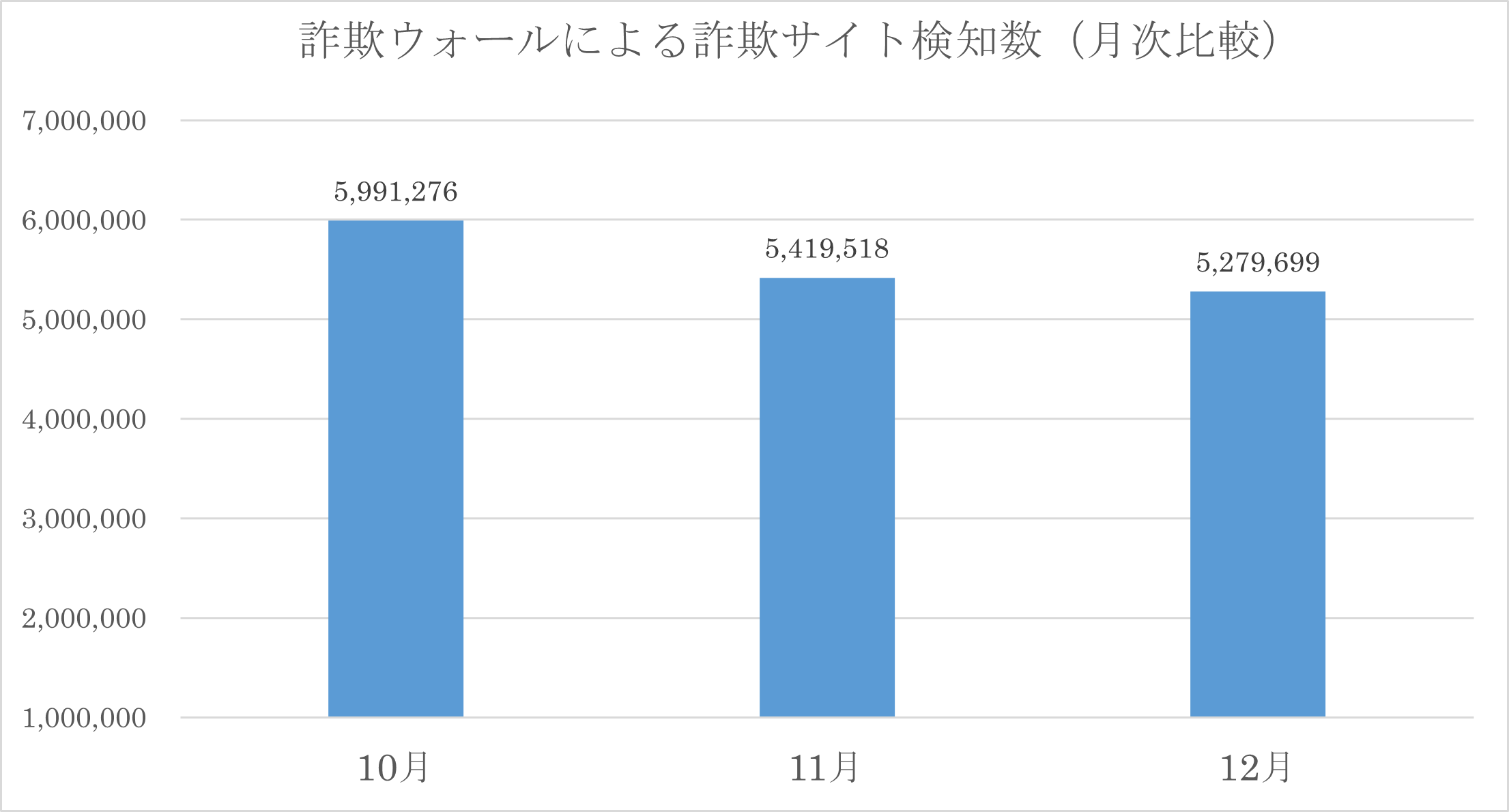 2023年12月の詐欺ウォールによる詐欺サイト検知数は5,279,699件で、2023年11月と比較すると、139,819件減少する結果となりました※。