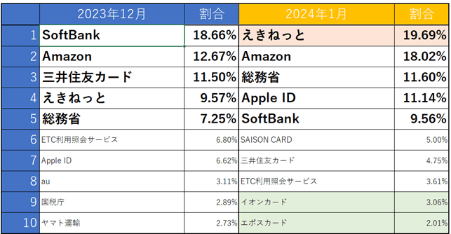 1月度はえきねっとが1位となりました。またAmazonが実数ベースで約40%増、総務省のマイナポイントのフィッシングサイトは約60%増と増加しています。また前月ランキングに比べてクレジットカード系のフィッシングサイトも増加しており、注意が必要です。