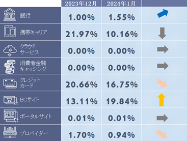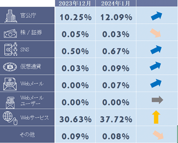 1月度はECサイトとWebサービスカテゴリの構成比が上昇しています。ECサイトはAmazonの報告数が増加したことにより実数ベースでも増加しています。またWebサービスは、えきねっと・ETCが実数で増加した影響で構成比も増加しています。上記で取り上げた携帯キャリアは1月度減少していますが、最新の情報では2月に入り増加しています。