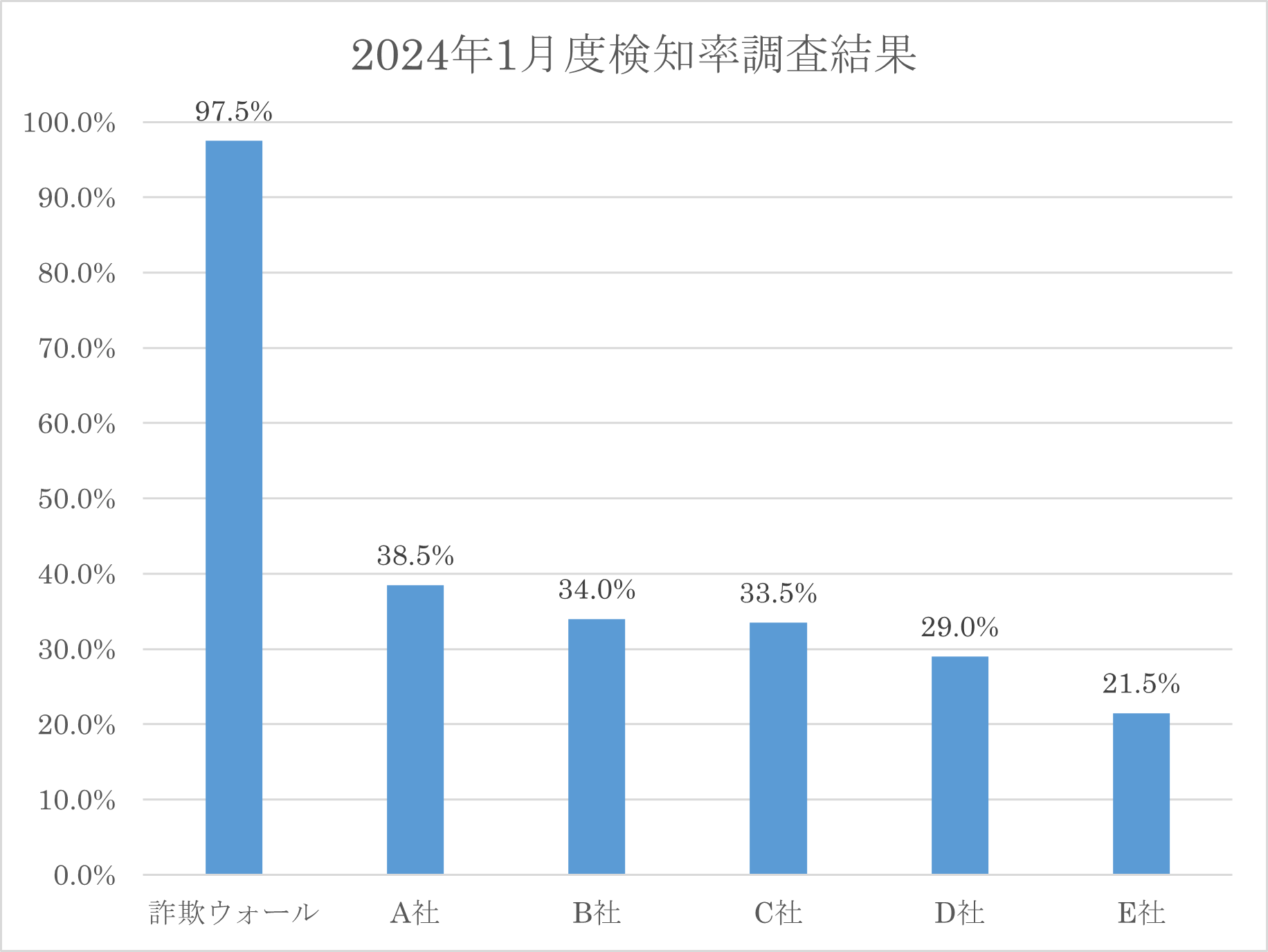 詐欺ウォールを開発・提供するBBソフトサービスでは、公的機関などとの連携によって収集した詐欺サイトURLを利用し、定期的に詐欺サイトの検知率調査を行っています。2024年1月の詐欺ウォールによる詐欺サイト検知率は97.5%と他社と比較し高い結果となりました。