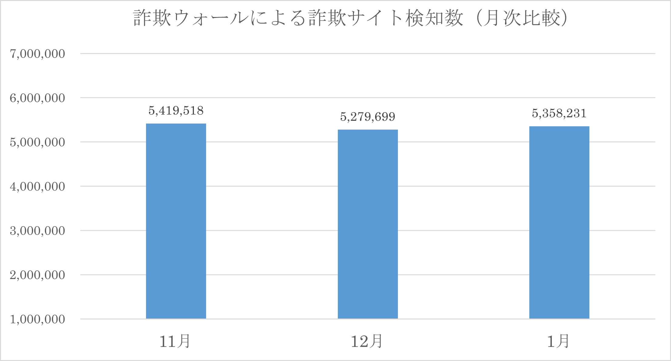 2024年1月の詐欺ウォールによる詐欺サイト検知数は5,358,231件で、2024年12月と比較すると、78,532件増加する結果となりました※。