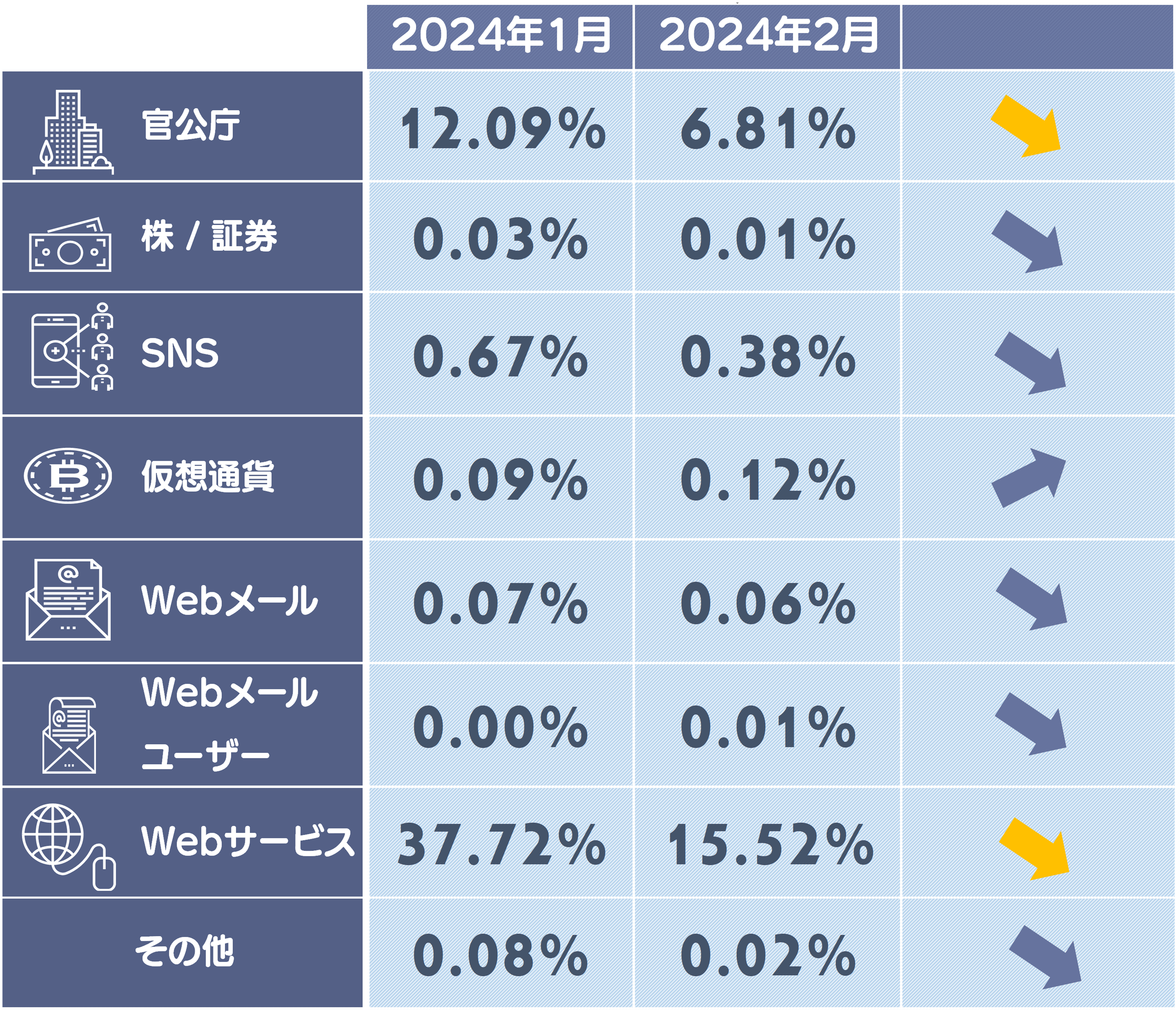 ※5ポイント以上減少したカテゴリは黄色の矢印になります。