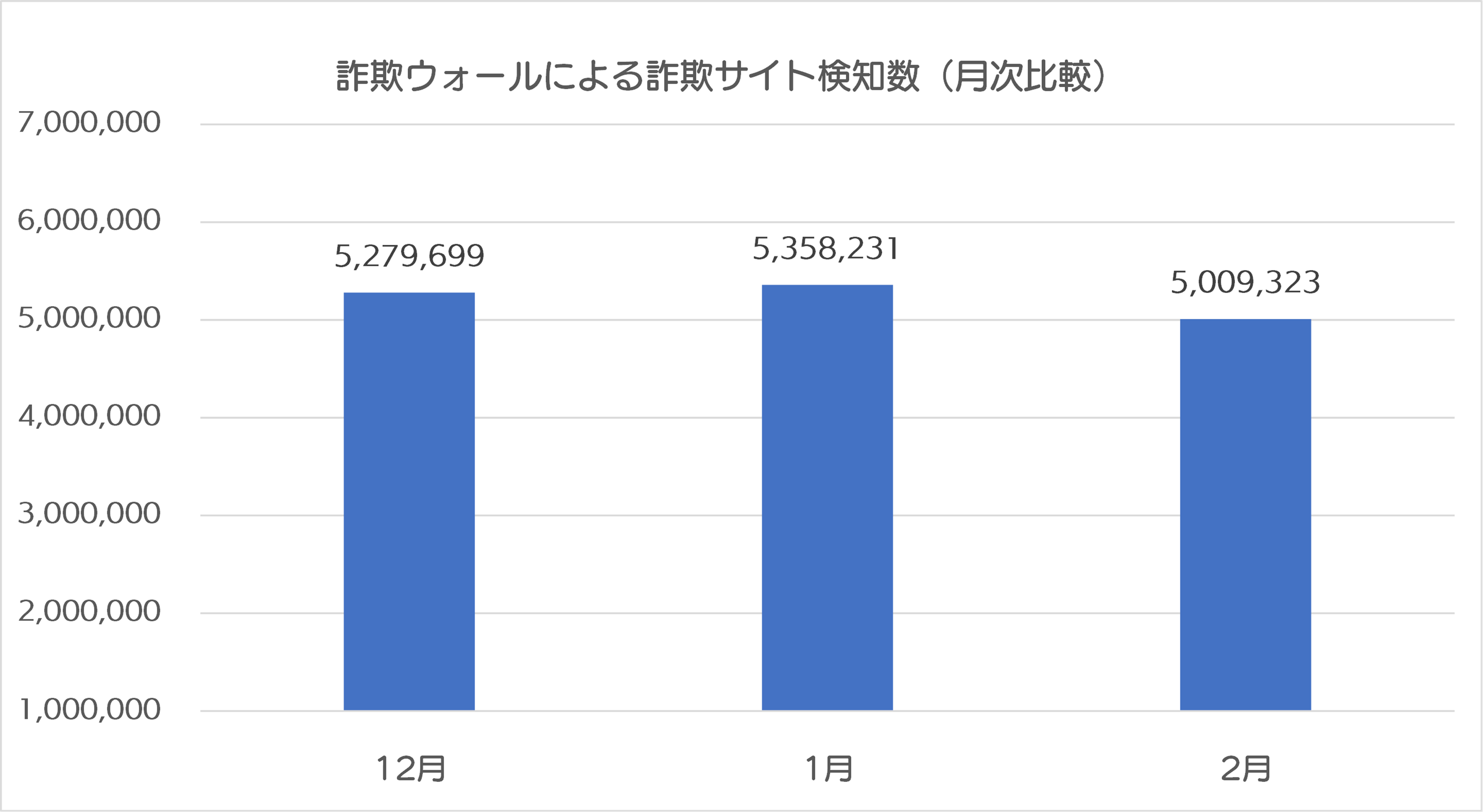 2024年2月の詐欺ウォールによる詐欺サイト検知数は5,009,323件で、2024年1月と比較すると、348,908件減少する結果となりました※。