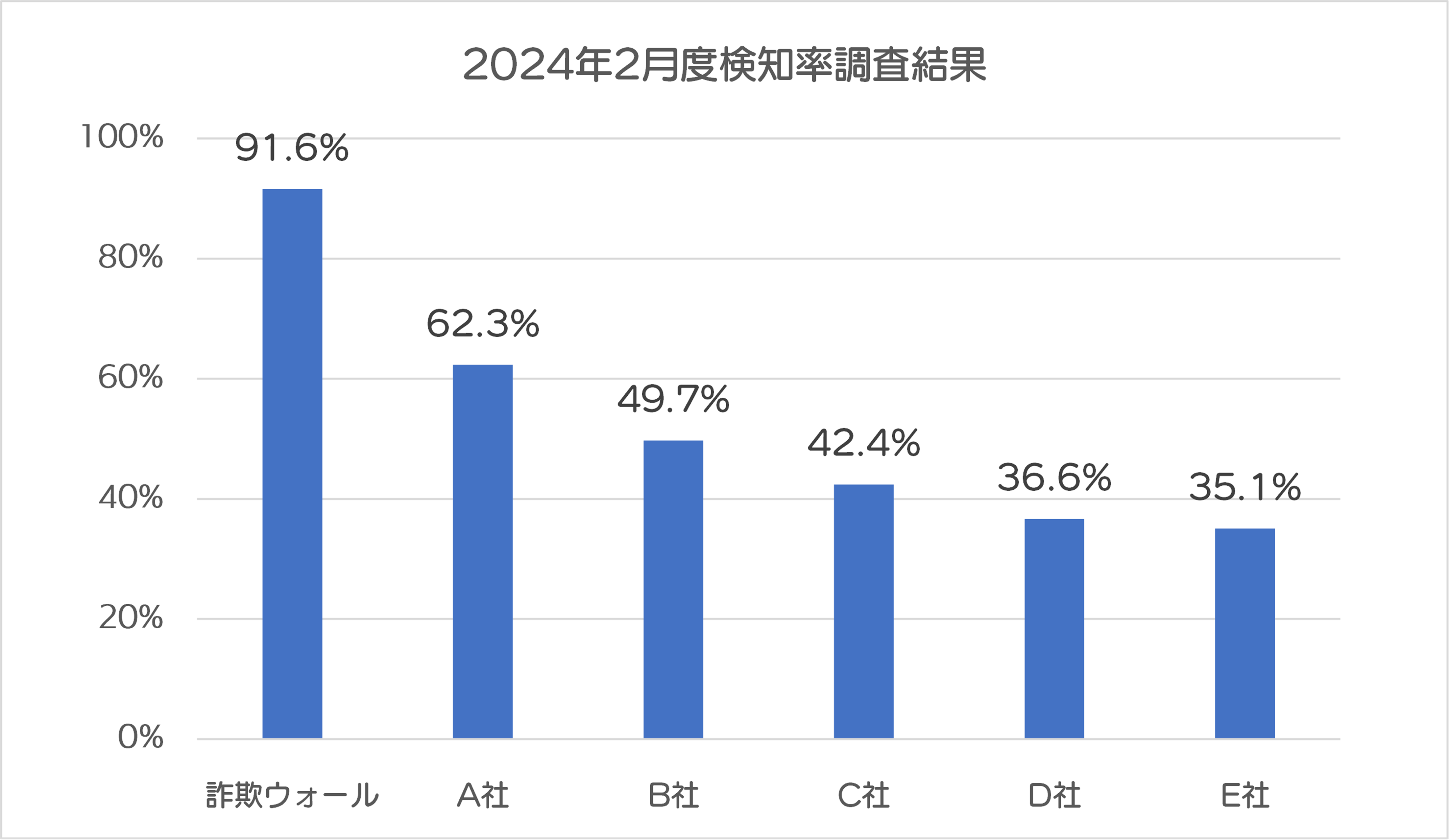 詐欺ウォールを開発・提供するBBソフトサービスでは、公的機関などとの連携によって収集した詐欺サイトURLを利用し、定期的に詐欺サイトの検知率調査を行っています。2024年2月の詐欺ウォールによる詐欺サイト検知率は91.6%と他社と比較し高い結果となりました。