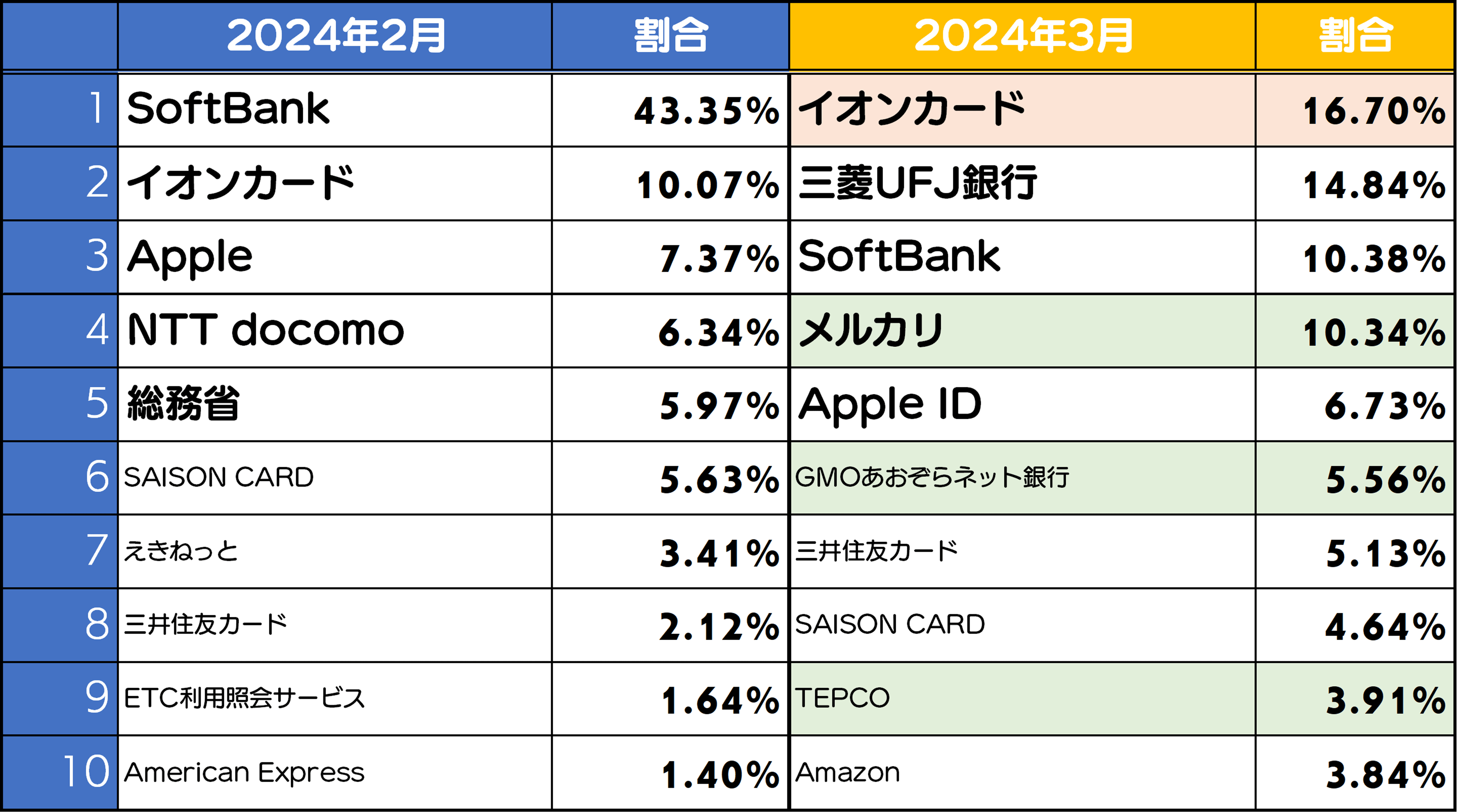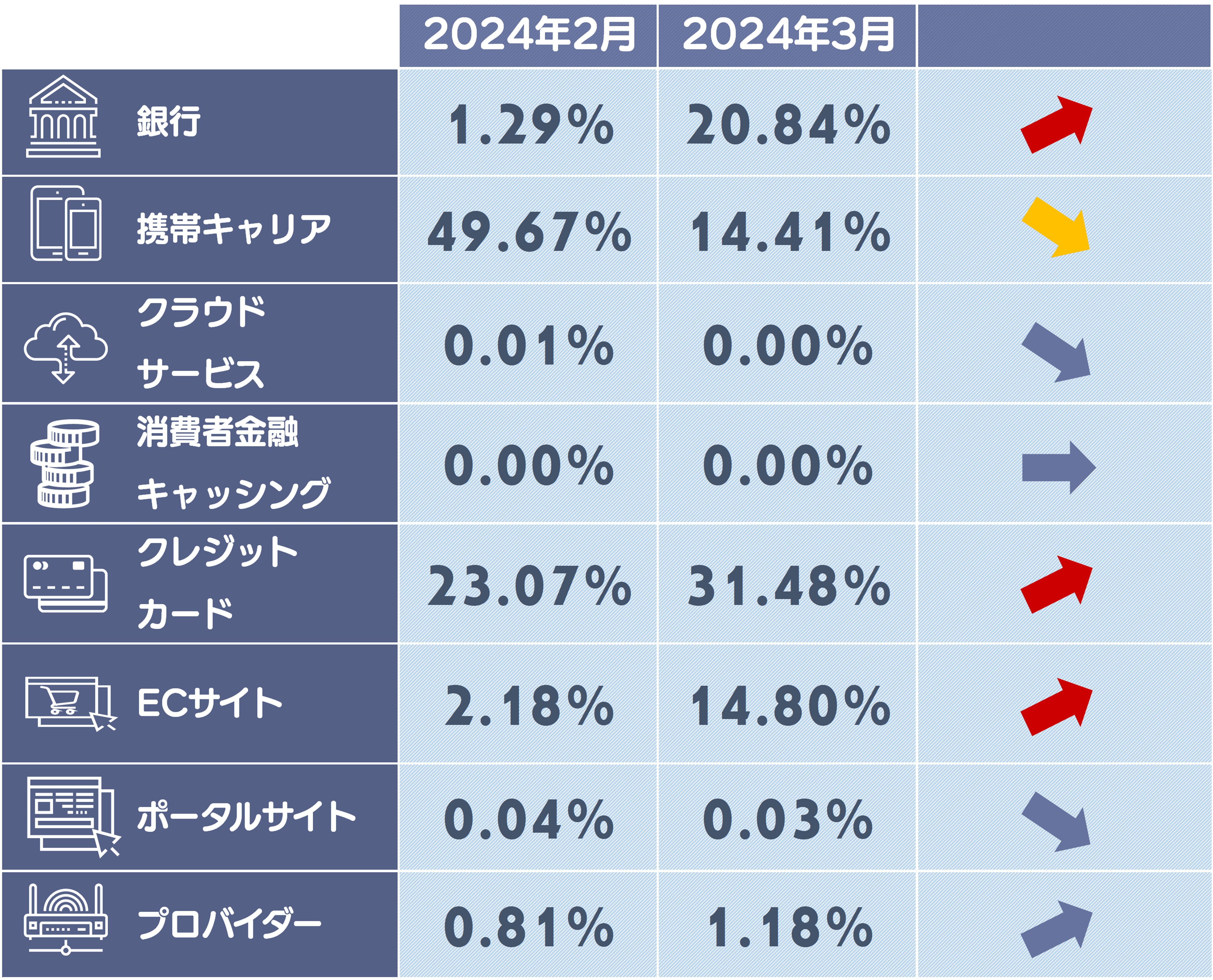 3月度は銀行とECサイトカテゴリの構成比が上昇しています。銀行は三菱UFJ銀行の報告数が増加したことにより実数ベースで増加しています。またECサイトは、メルカリが実数で増加した影響で構成比も増加しています。携帯キャリアはSoftBankが減少したことにより減少しています。