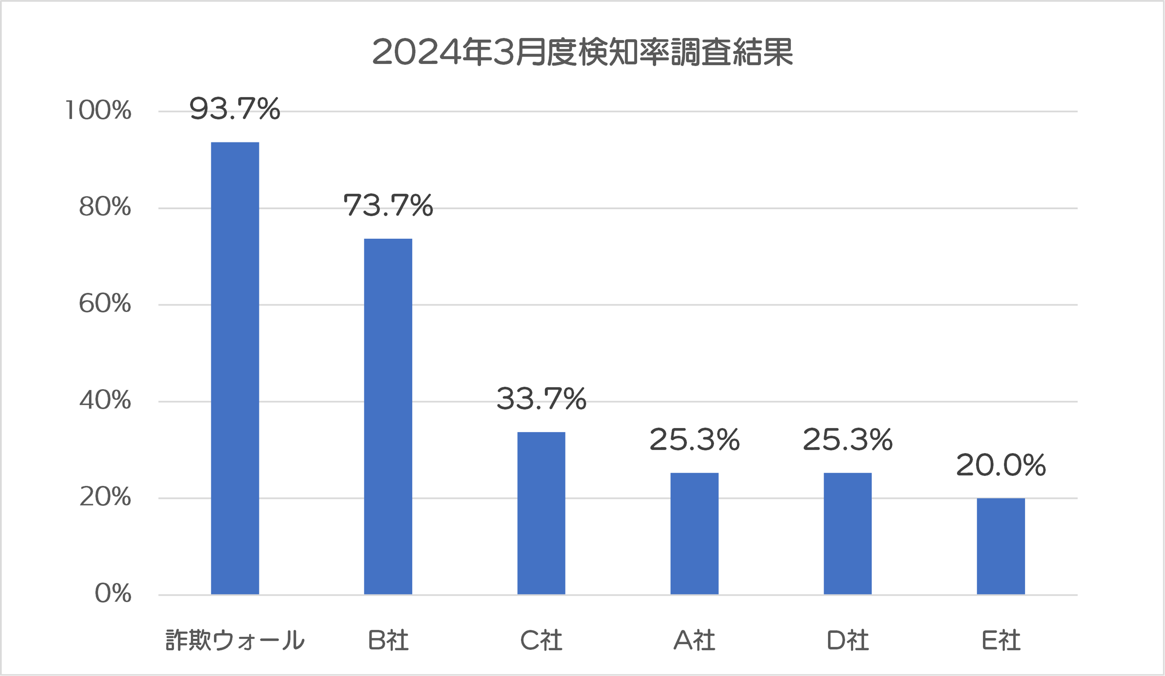 詐欺ウォールを開発・提供するBBソフトサービスでは、公的機関などとの連携によって収集した詐欺サイトURLを利用し、定期的に詐欺サイトの検知率調査を行っています。2024年3月の詐欺ウォールによる詐欺サイト検知率は93.7%と他社と比較し高い結果となりました。