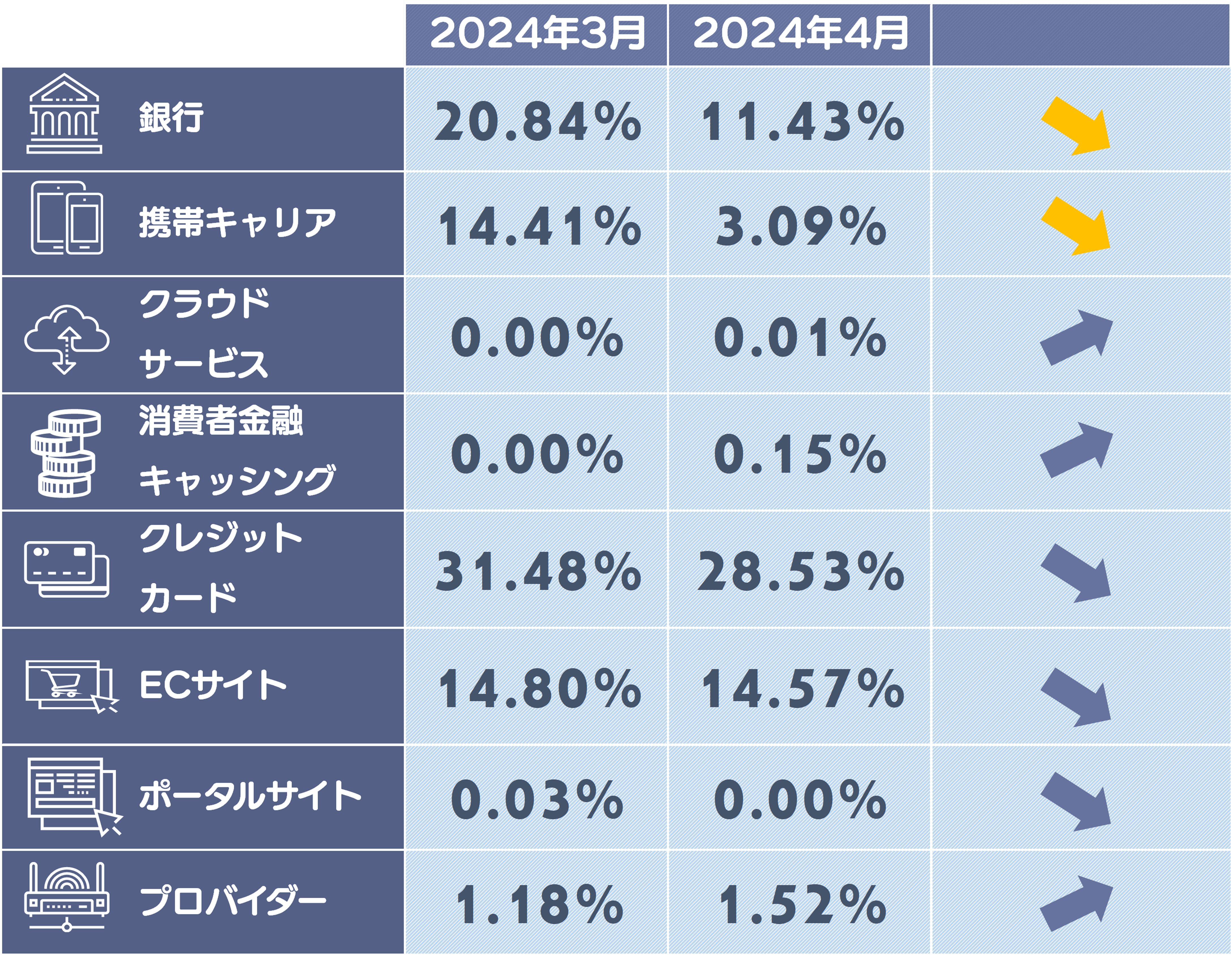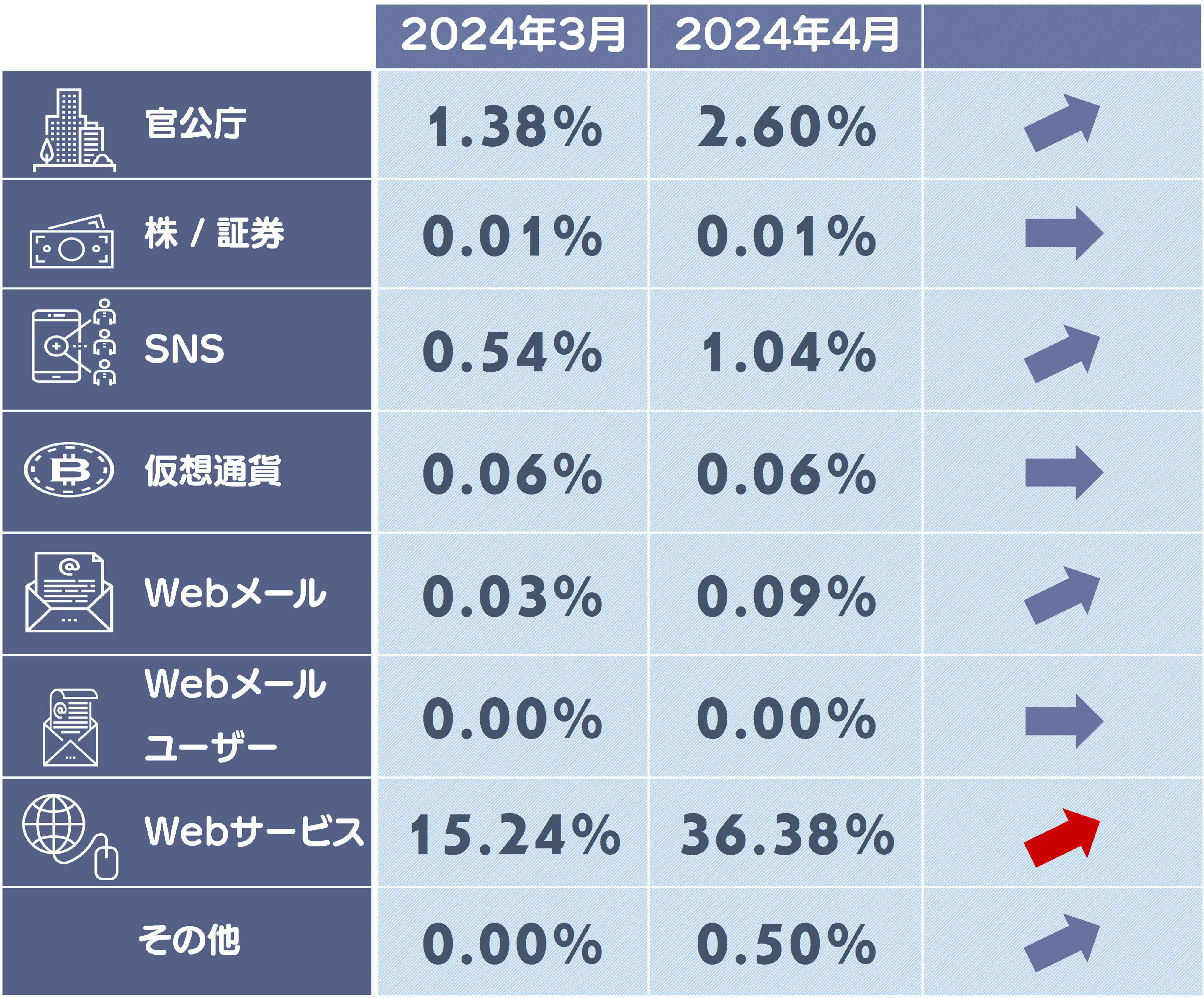 4月度はWebサービスカテゴリの構成比が上昇しています。TEPCO増加に伴い構成比が上昇しています。銀行は9ポイント減少していますが、三菱UFJ銀行の報告数が減少したことが起因しています。ですが高止まりの傾向があるため注意が必要です。携帯キャリアはSoftBankの報告数が減ったことにより構成比が減少しています。