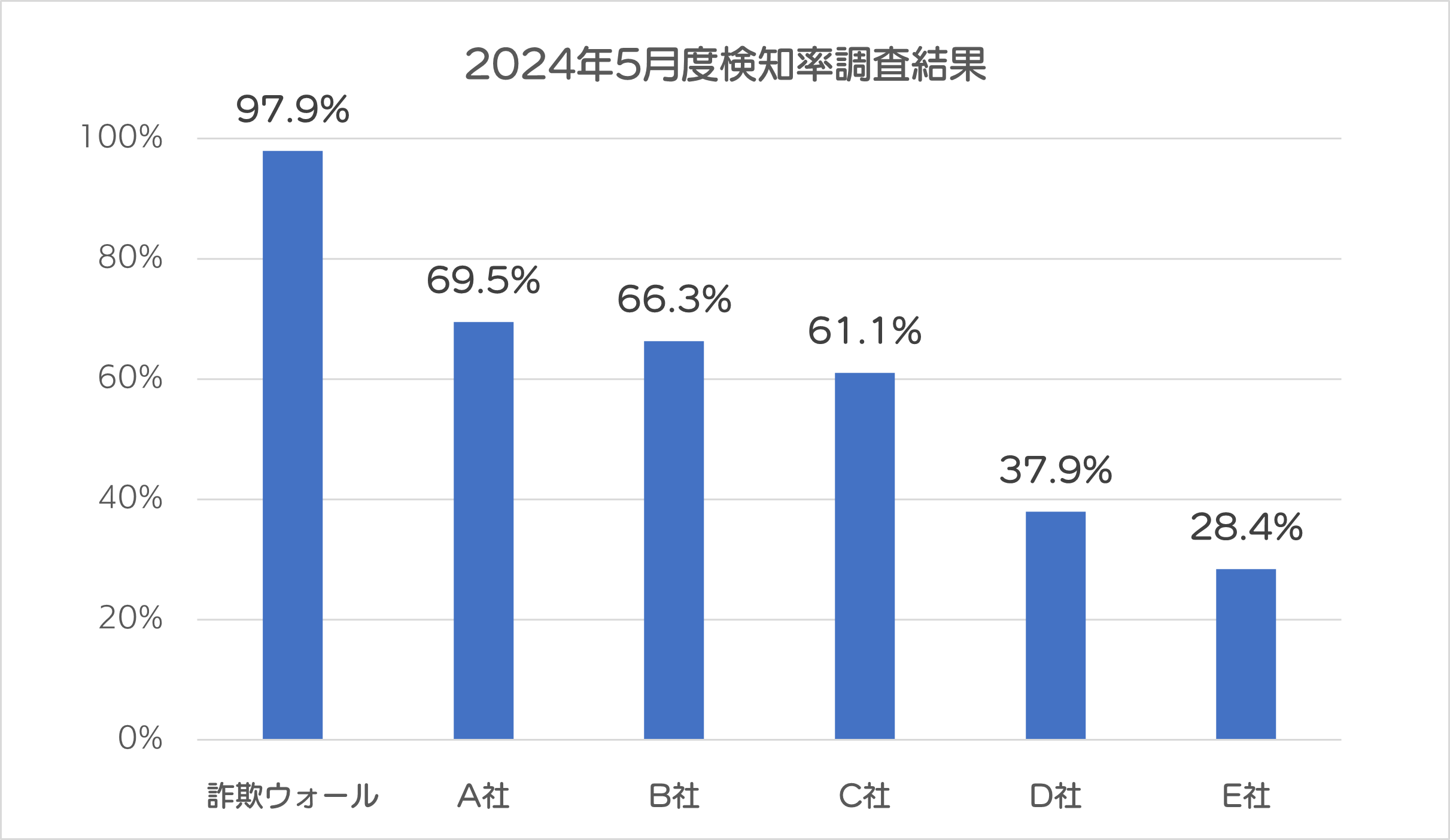 詐欺ウォールを開発・提供するBBソフトサービスでは、公的機関などとの連携によって収集した詐欺サイトURLを利用し、定期的に詐欺サイトの検知率調査を行っています。2024年5月の詐欺ウォールによる詐欺サイト検知率は97.9%でした。
