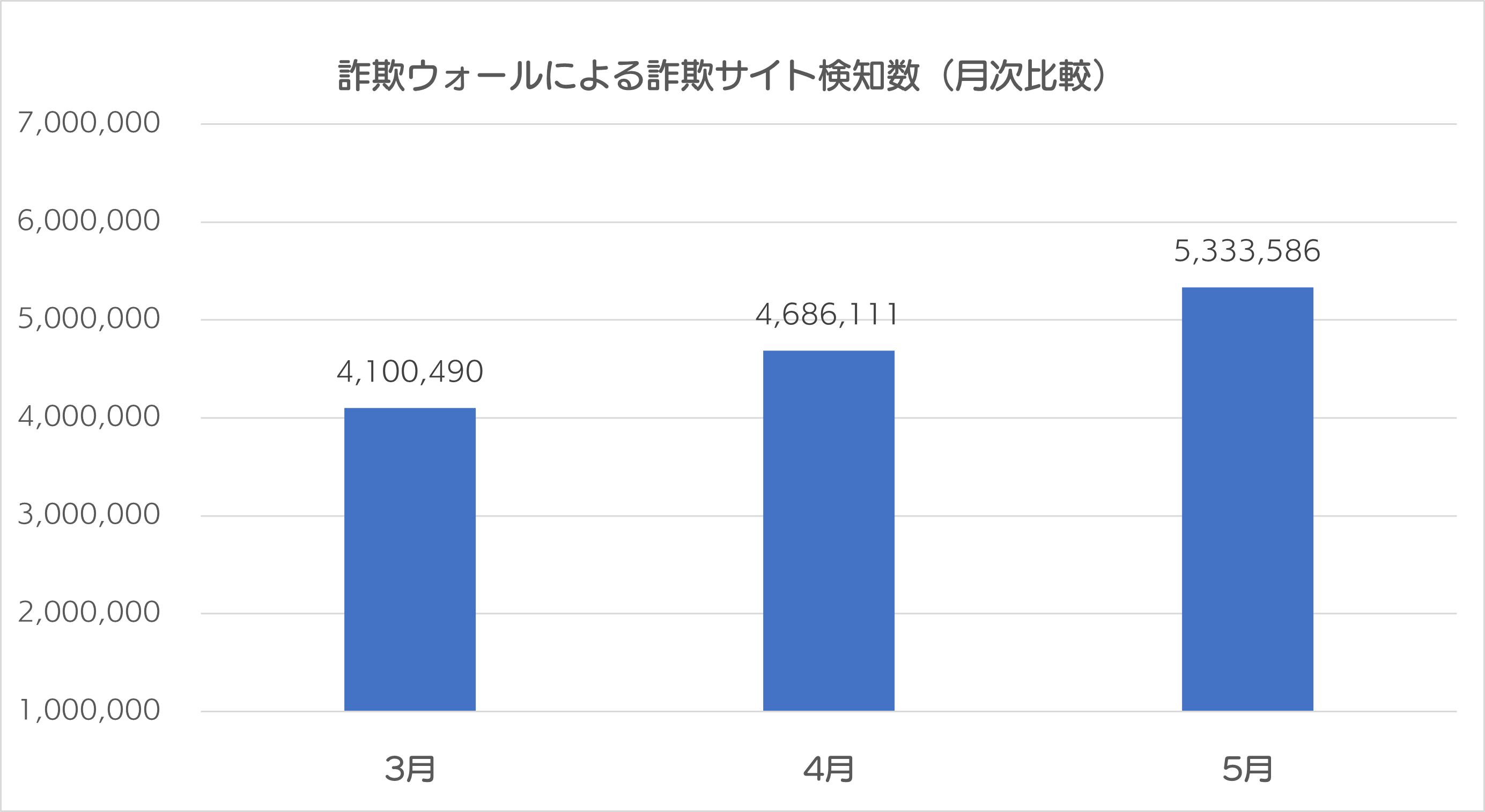 2024年5月の詐欺ウォールによる詐欺サイト検知数は5,333,586件で、前月から647,475件増加する結果となりました※。