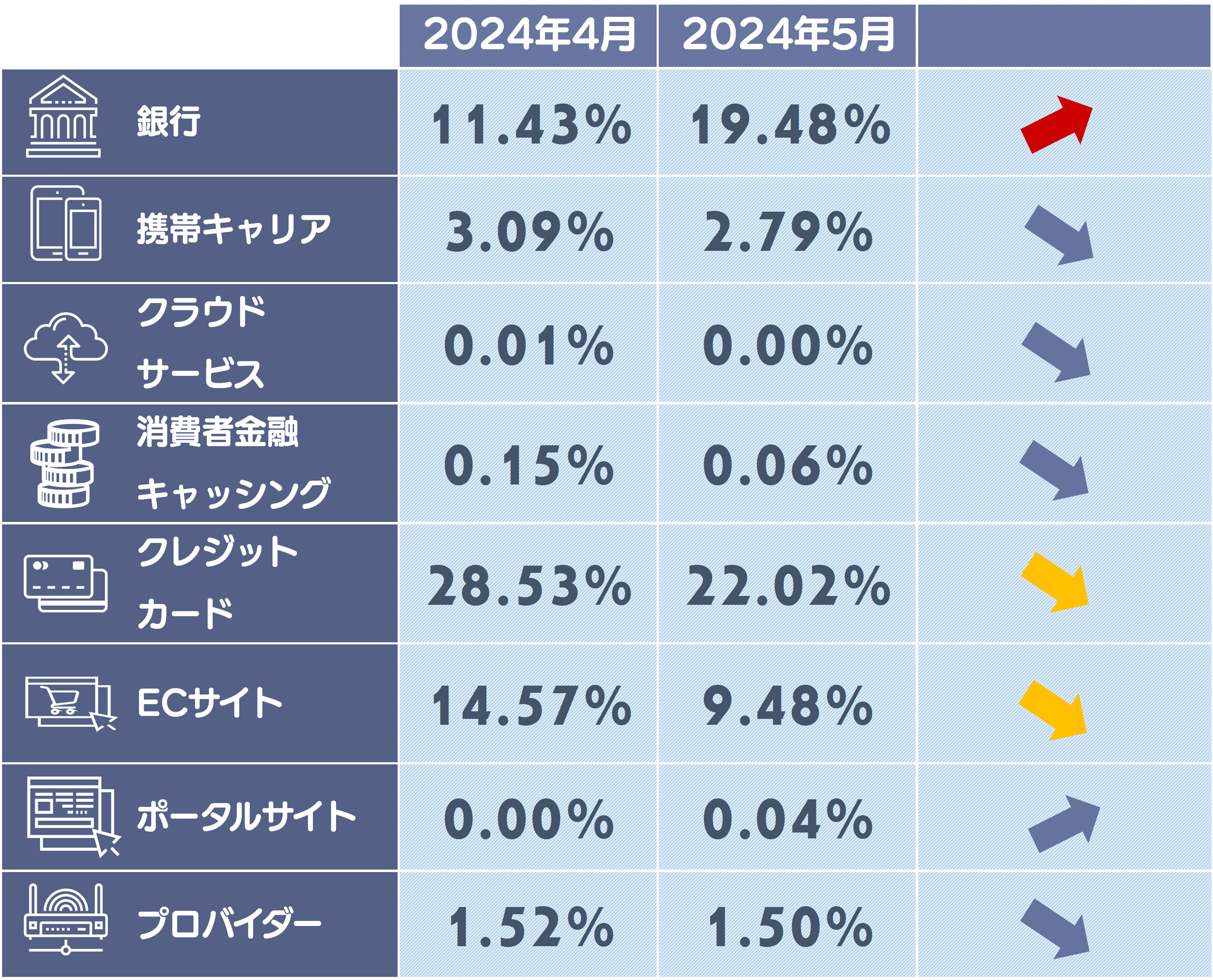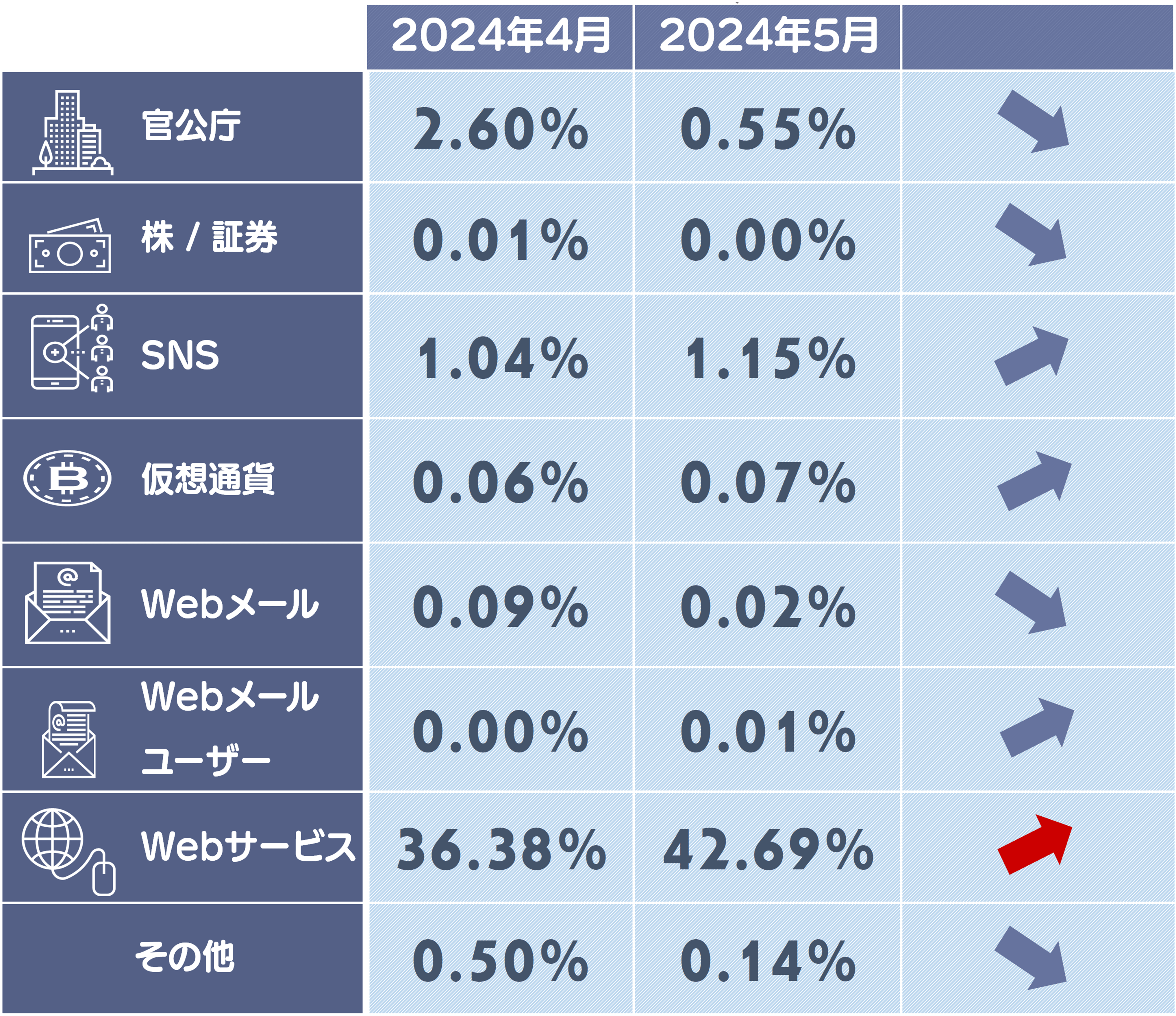 5月度はAppleや三菱UFJ銀行を騙るフィッシングサイトの増加に伴い、Webサービスと銀行カテゴリの構成比が上昇しています。