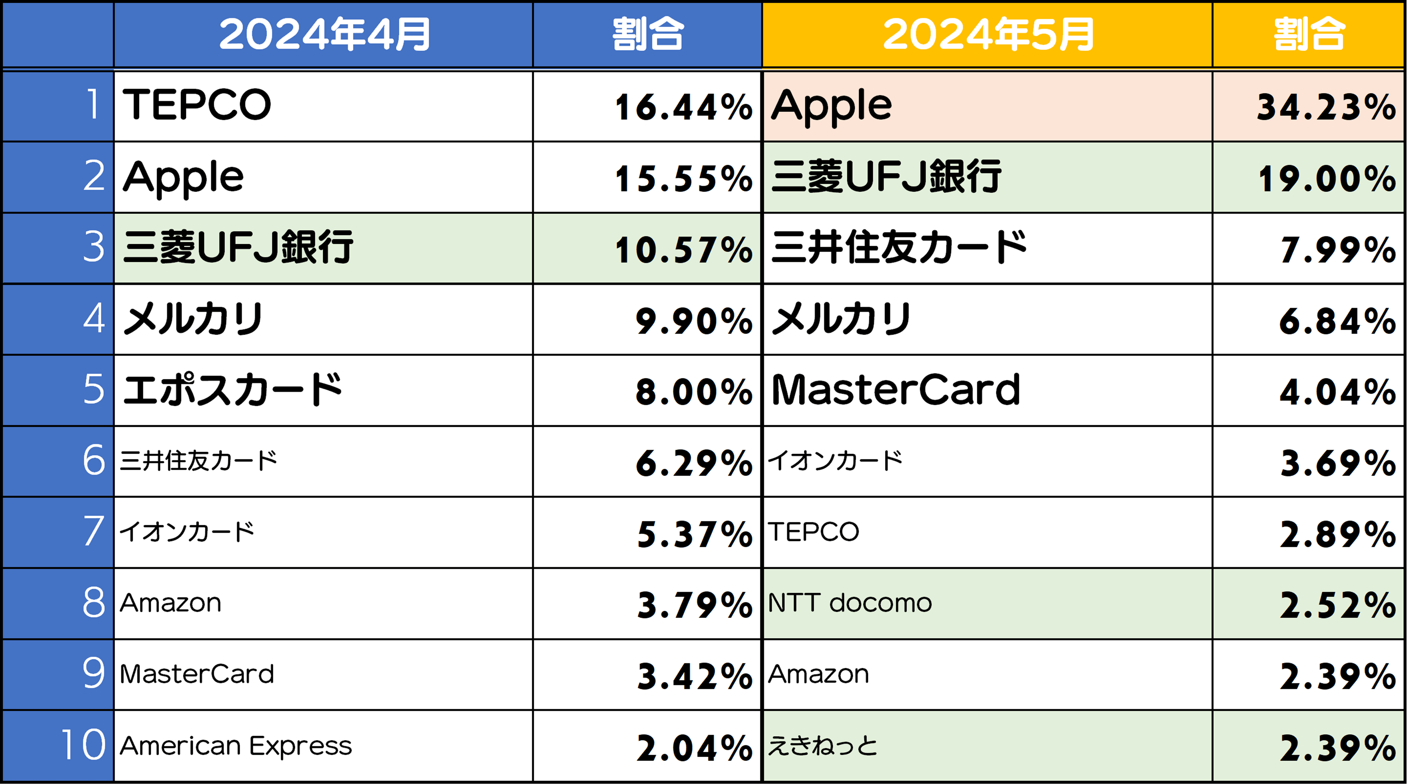 5月度はAppleが1位となりました。2位の三菱UFJ銀行は前月から高止まりしています。またここ最近は下火になっていたえきねっとが再度増加しており、NTT docomoも増加傾向にあります。