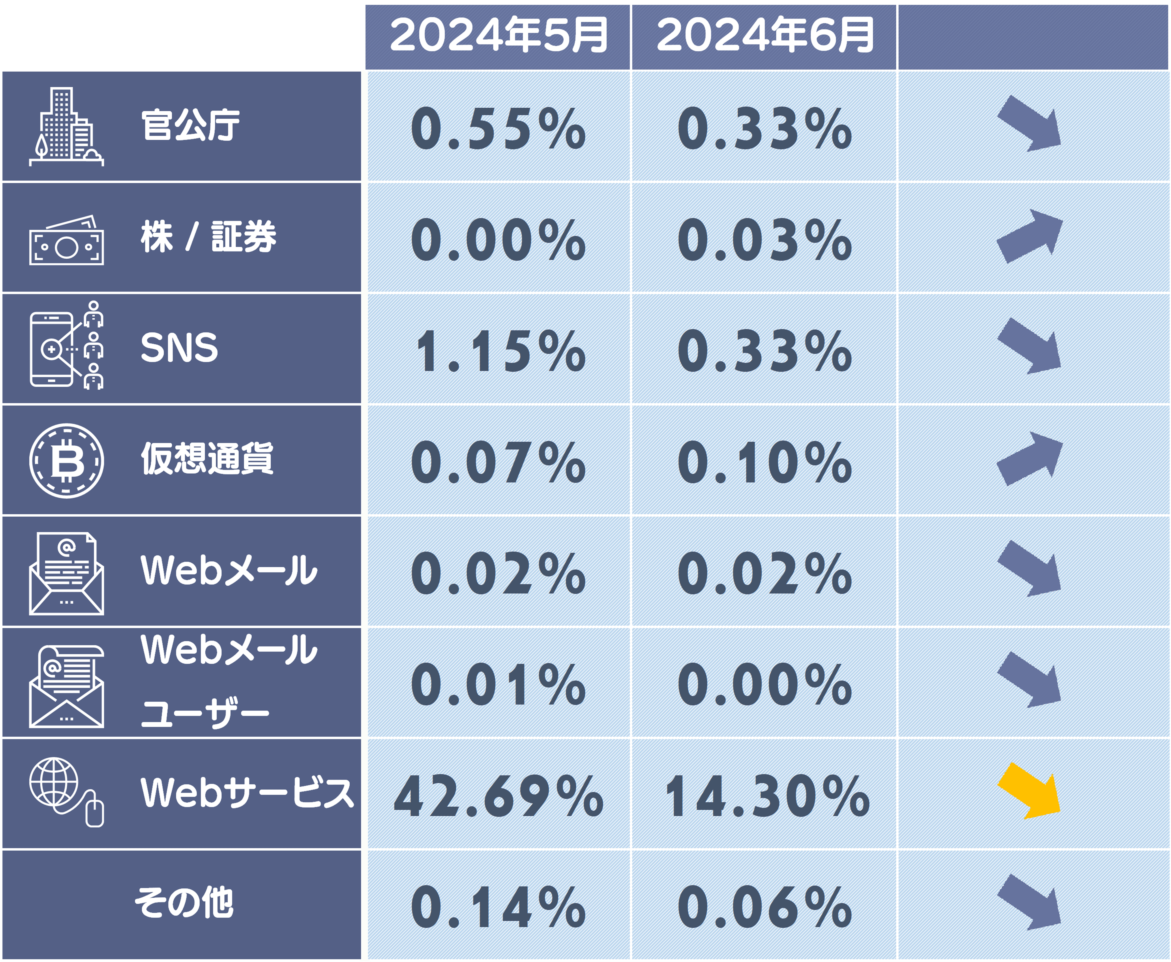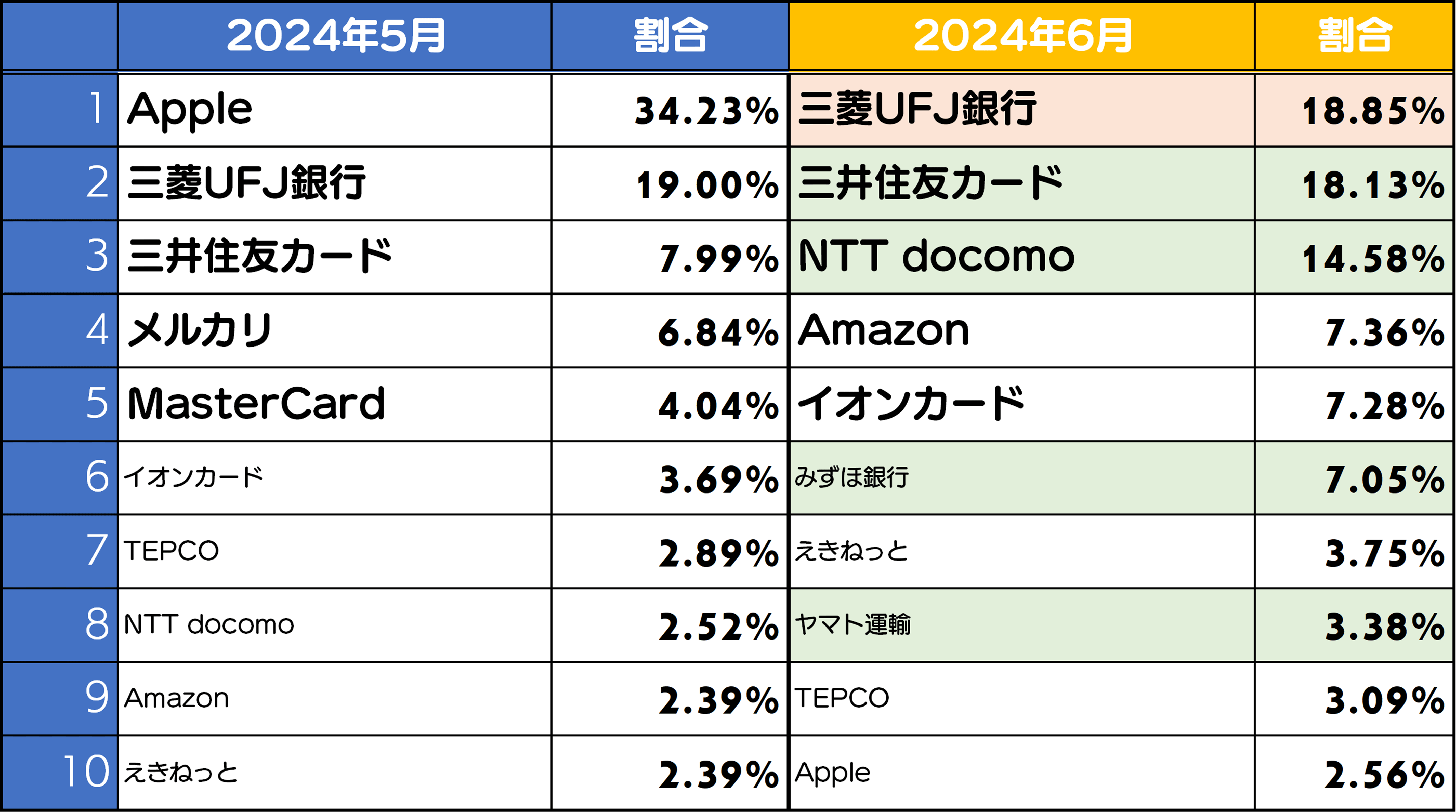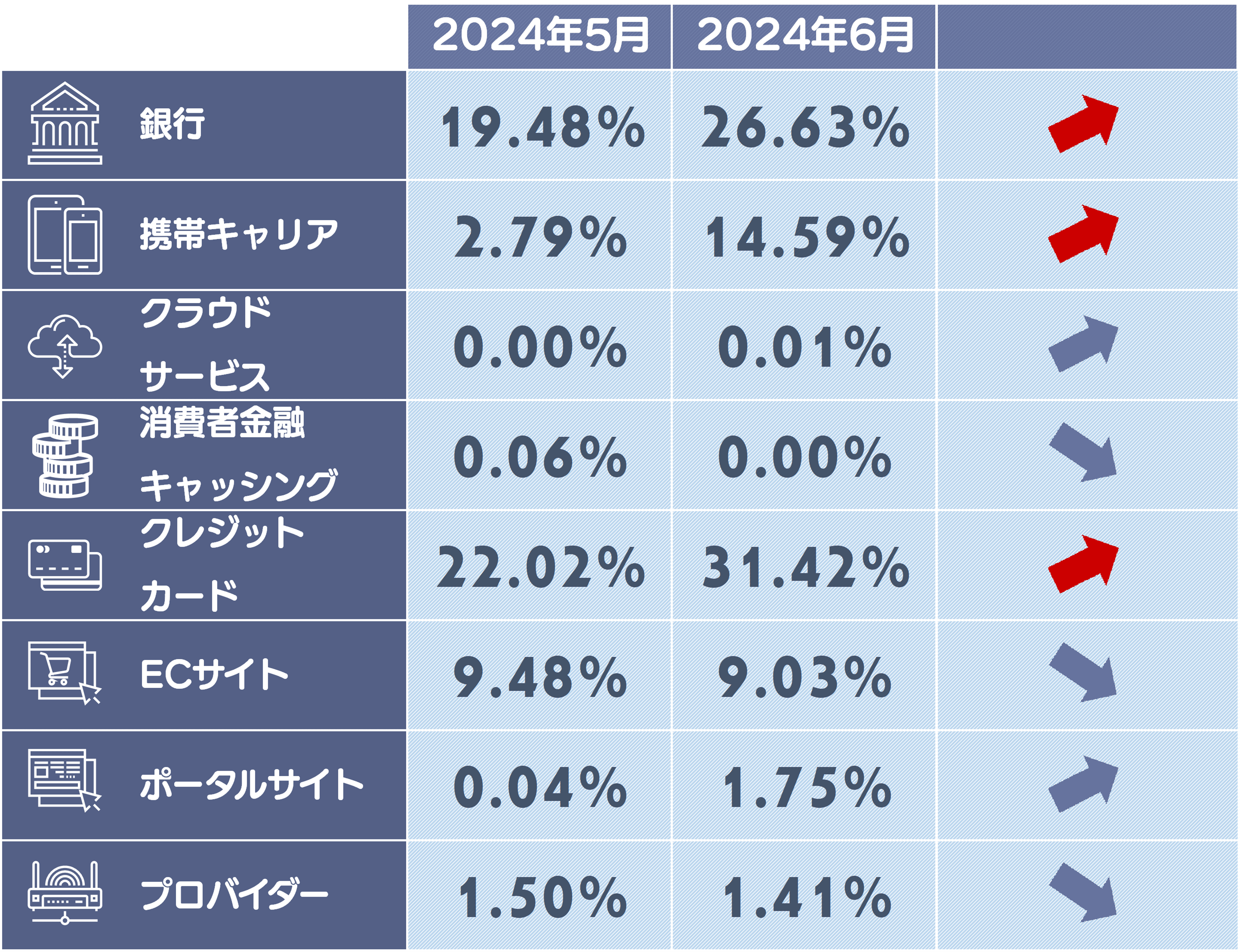 6月度はクレジットカード、銀行、携帯キャリアの構成比が上昇しています。クレジットカードは三井住友カード、銀行はみずほ銀行、携帯キャリアはNTT docomoの報告数が上昇していることが起因しています。