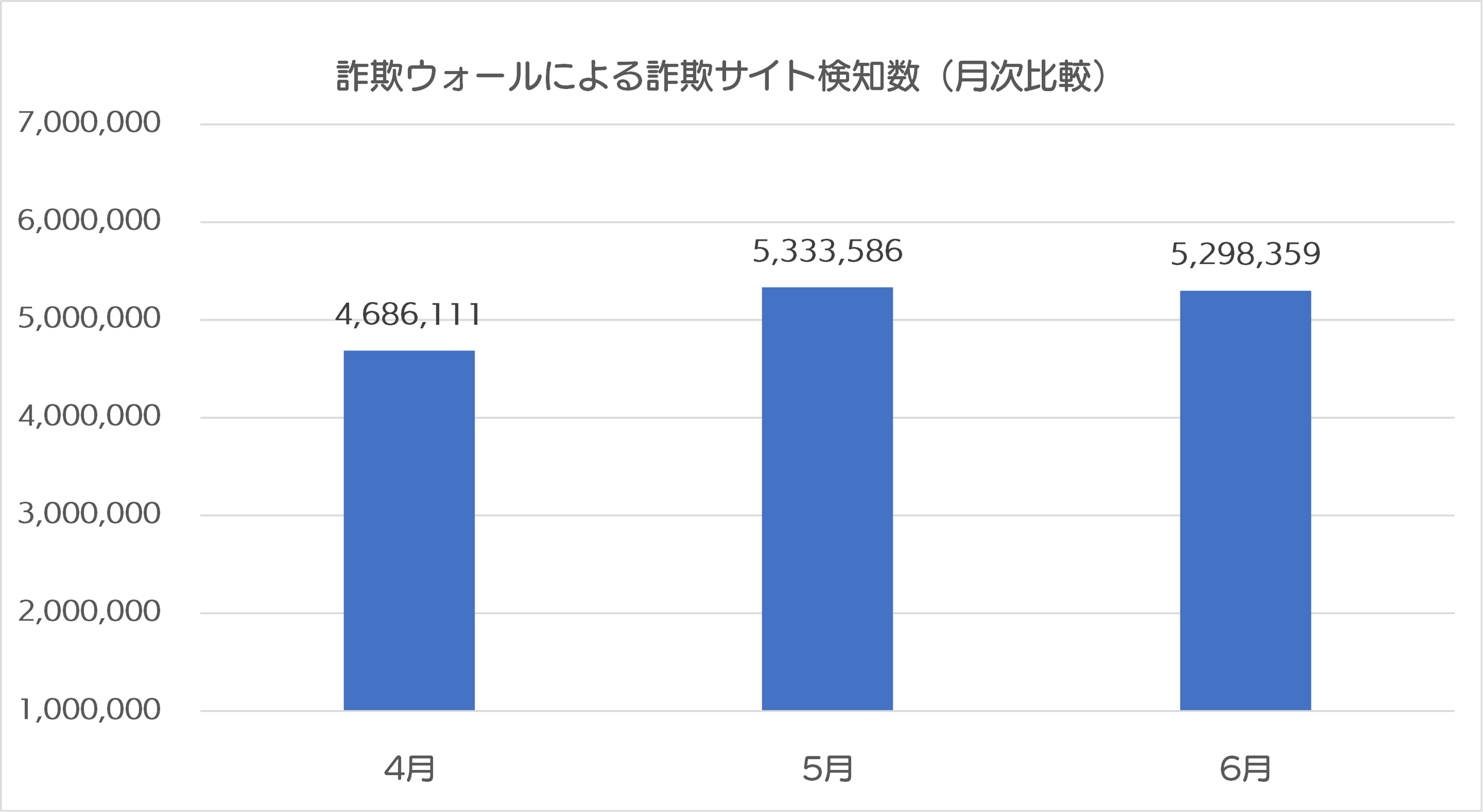 2024年6月の詐欺ウォールによる詐欺サイト検知数は5,298,359件で、2024年5月と比較して35,227件減少しました※。