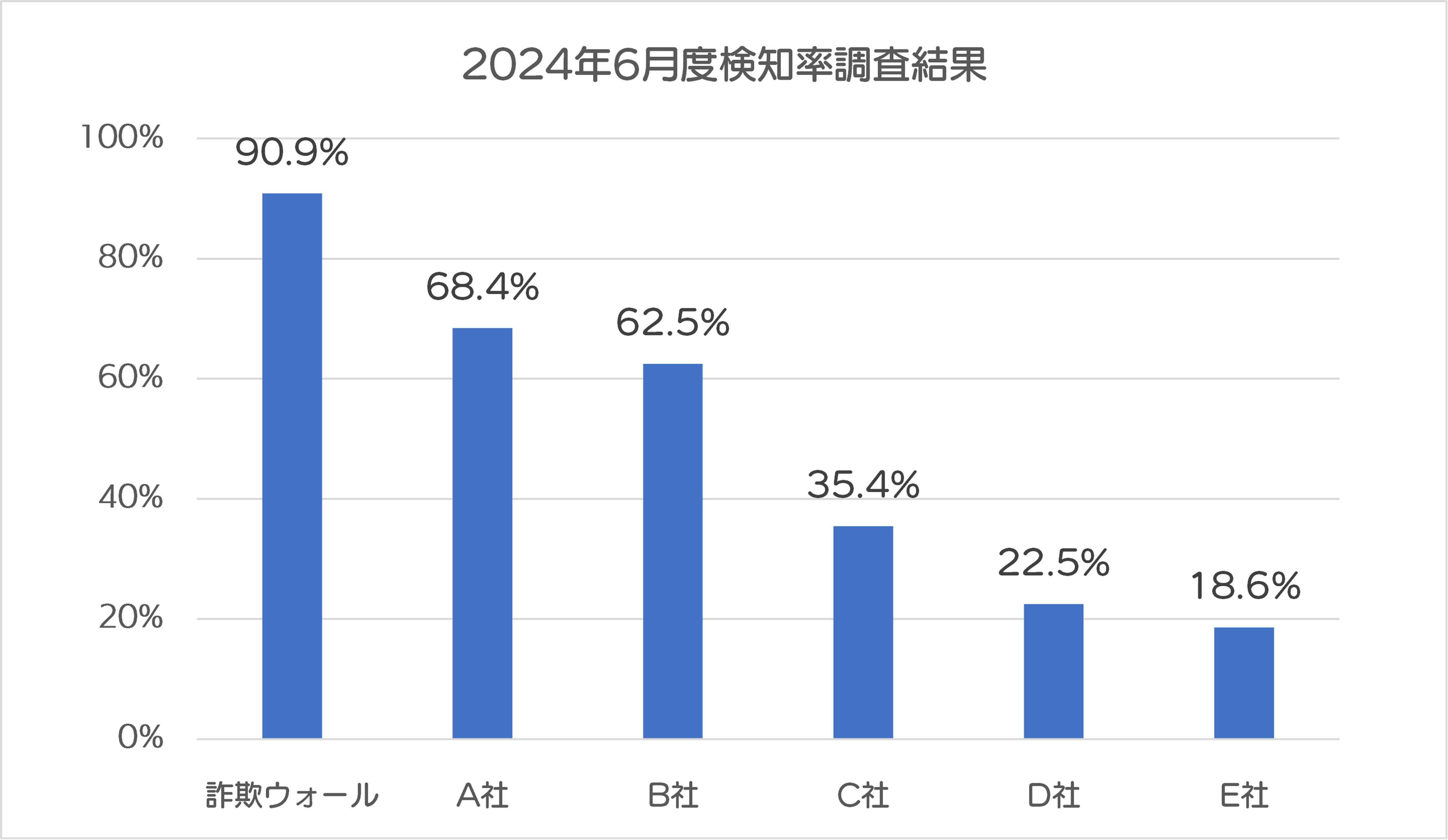 詐欺ウォールを開発・提供するBBソフトサービスでは、公的機関などとの連携によって収集した詐欺サイトURLを利用し、定期的に詐欺サイトの検知率調査を行っています。2024年6月の詐欺ウォールによる詐欺サイト検知率は90.9%と他社と比較し高い結果となりました。