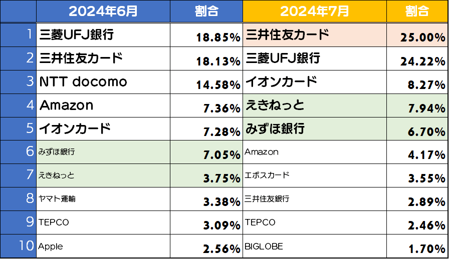 7月度は三井住友カードが1位となりました。ここ数か月報告数が上位にあり注意が必要です。2位には三菱UFJ銀行がランクイン、みずほ銀行や三井住友銀行など大手銀行もランクインしています。