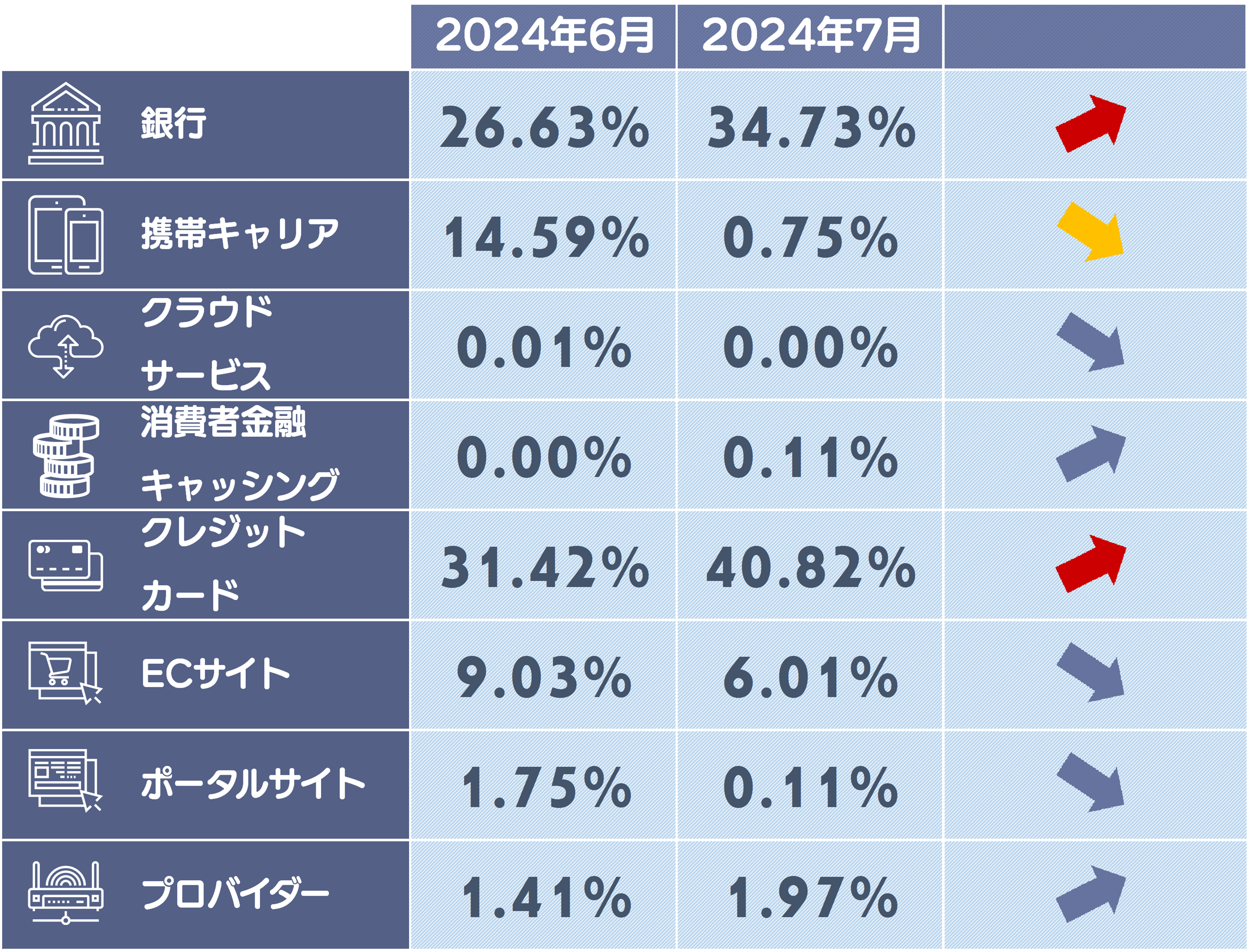 7月度はクレジットカード・銀行の構成比が上昇しています。クレジットカードは三井住友カード、銀行は大手3行のフィッシングサイトが影響して構成比が増加しています。携帯キャリアはNTT docomoの報告数が減少したことにより構成比が減少しています。