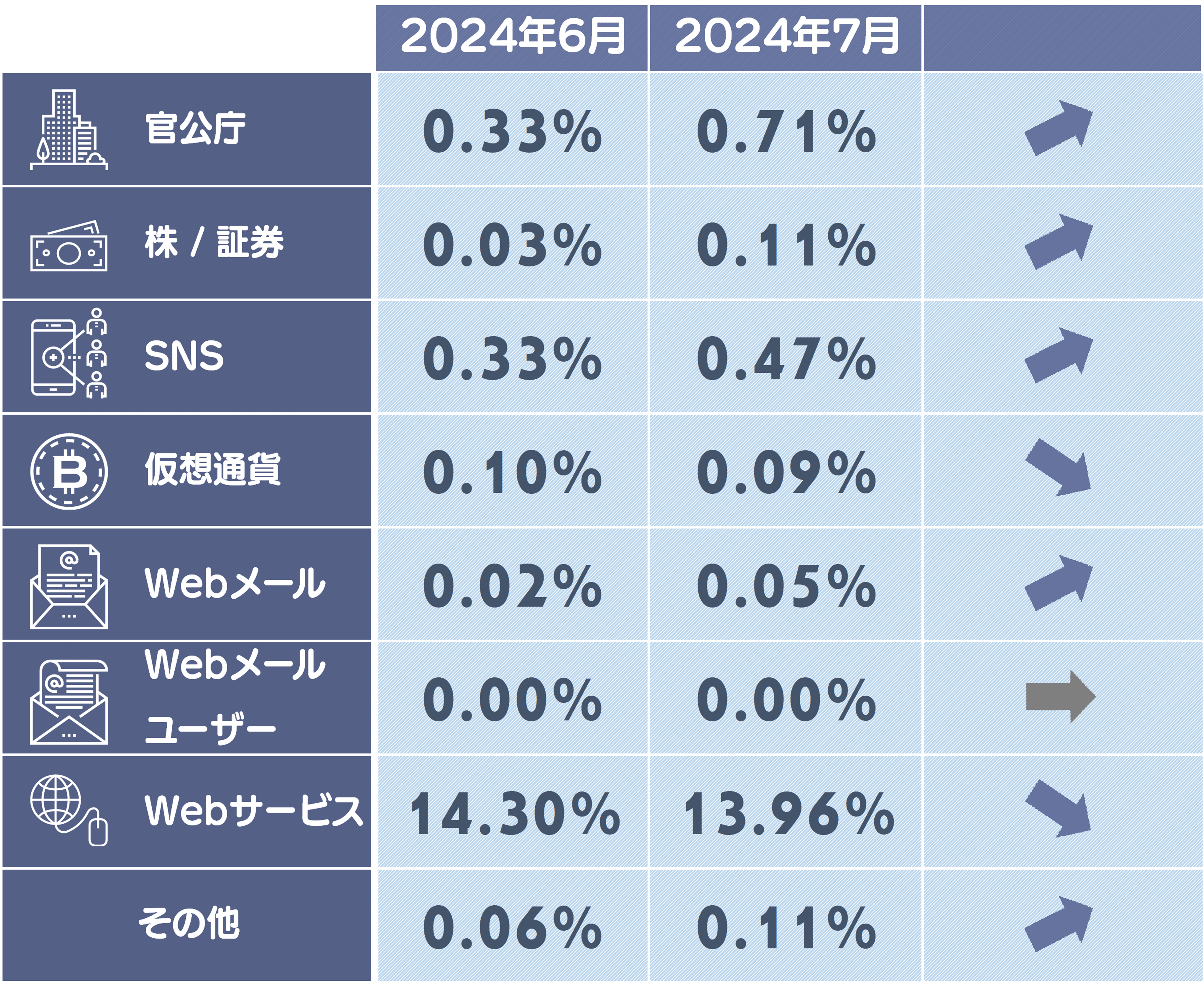 7月は前月に引き続き、三井住友カード、三菱UFJ銀行のフィッシングサイトの報告数が高止まりしています。「不審な取引が確認された」など様々な内容で注意を引き、ログイン情報を詐取する手口です。また6月からえきねっとのフィッシングサイトが増加しており、7月、8月も同様の傾向が続いています。帰省シーズンに合わせて交通系のサービスを騙るフィッシング詐欺が行われている可能性もあり注意が必要です。