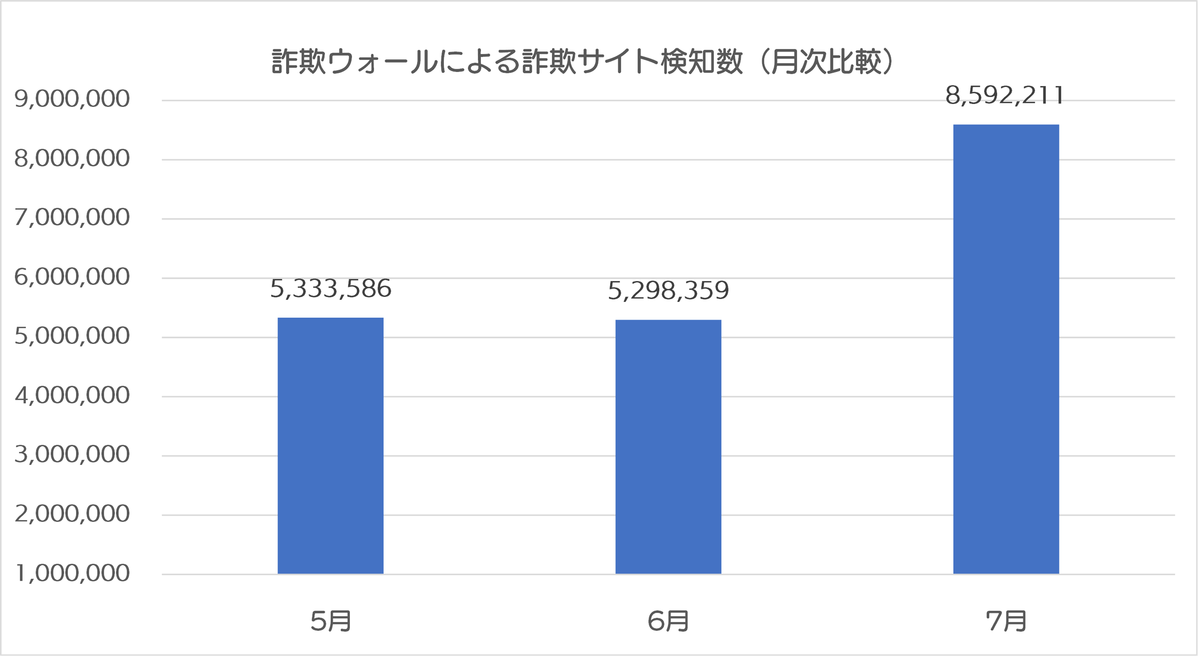 2024年7月の詐欺ウォールによる詐欺サイト検知数は8,592,211件で、2024年6月と比較すると、3,293,852件増加する結果となりました※。
