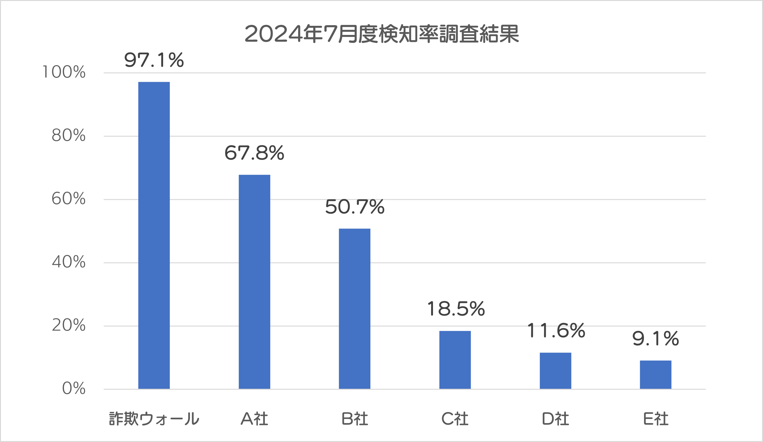 詐欺ウォールを開発・提供するBBソフトサービスでは、公的機関などとの連携によって収集した詐欺サイトURLを利用し、定期的に詐欺サイトの検知率調査を行っています。2024年7月の詐欺ウォールによる詐欺サイト検知率は97.1%と他社と比較し高い結果となりました。