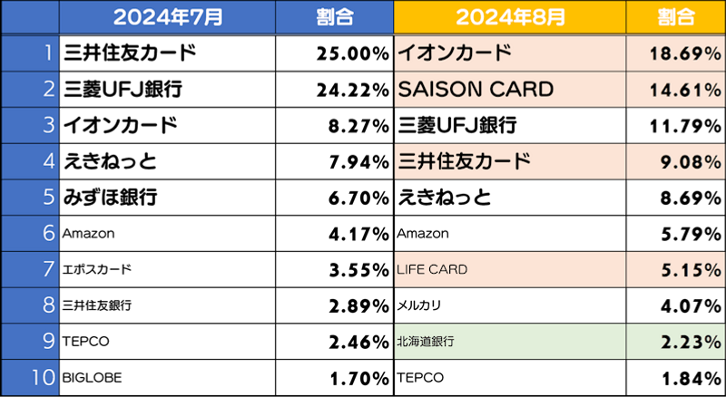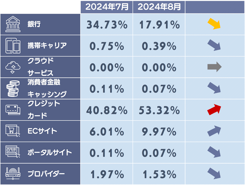 8月度はクレジットカードの構成比が上昇しています。イオンカード、SAISON CARD,三井住友カードなどの報告数が増加したことにより構成比が増加し、全カテゴリの中で50%の割合をしめています。