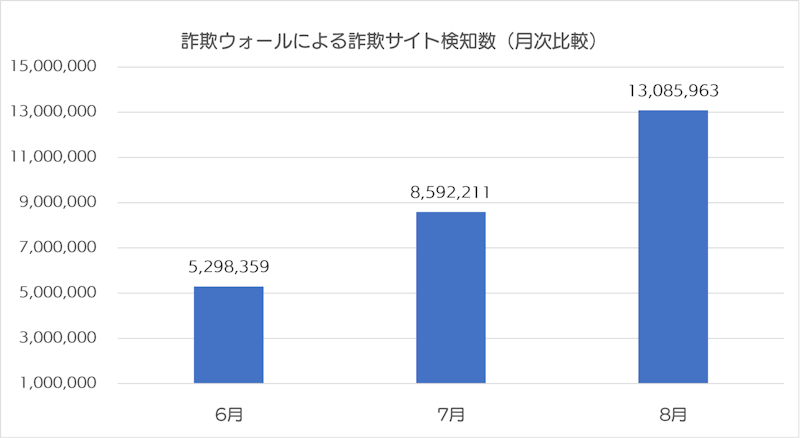 2024年8月の詐欺ウォールによる詐欺サイト検知数は13,085,963件で、2024年7月と比較すると、4,493,752件増加する結果となりました※。