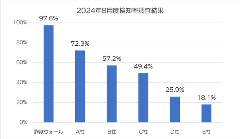詐欺ウォールを開発・提供するBBソフトサービスでは、公的機関などとの連携によって収集した詐欺サイトURLを利用し、定期的に詐欺サイトの検知率調査を行っています。2024年8月の詐欺ウォールによる詐欺サイト検知率は97.6%と他社と比較し高い結果となりました。