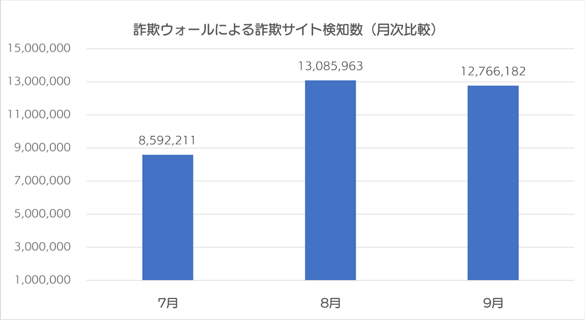 2024年9月の詐欺ウォールによる詐欺サイト検知数は12,766,182件で、2024年8月と比較すると、319,781件減少する結果となりました※。