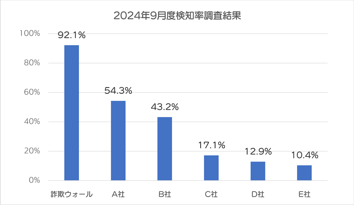 詐欺ウォールを開発・提供するBBソフトサービスでは、公的機関などとの連携によって収集した詐欺サイトURLを利用し、定期的に詐欺サイトの検知率調査を行っています。2024年9月の詐欺ウォールによる詐欺サイト検知率は92.1%と他社と比較し高い結果となりました。