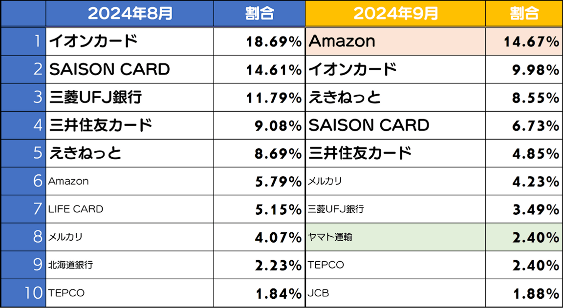 9月度はAmazonが1位となりました。報告数が2倍に増加しています。先月急増したLIFE CARDや北海道銀行などは報告数が減少しており、ランク外となっています。今月はヤマト運輸がランクインし報告数が約2倍に増加しています。