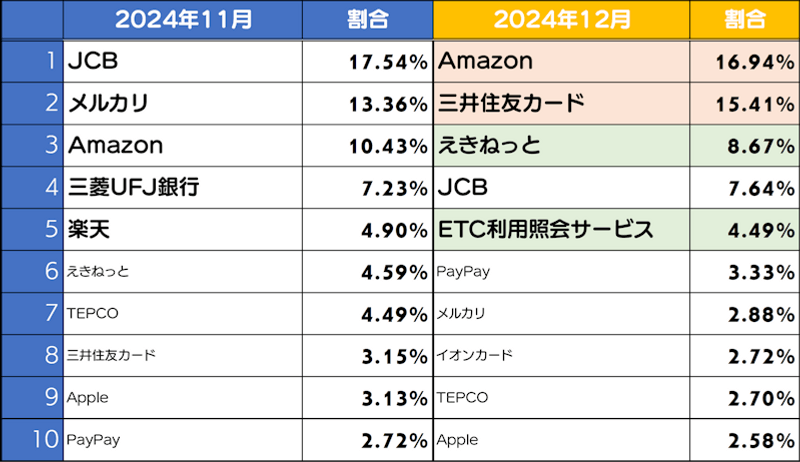 12月度はAmazonが1位となりました。2位の三井住友カードは4倍に増加しています。イオンカードなどが新しくランクインしています。前月ランクインしたPayPayも高止まりしている状況で注意が必要です。