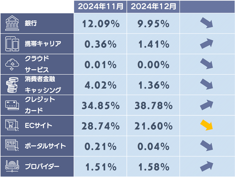 12月度はクレジットカードのフィッシングサイトが増加したことに伴い、構成比が上昇しています。またここ数か月報告の多かった消費者金融は12月に入り3分の1まで減少しています。様々なカテゴリが規則性なく増減しているため、すべてのカテゴリで注意が必要です。