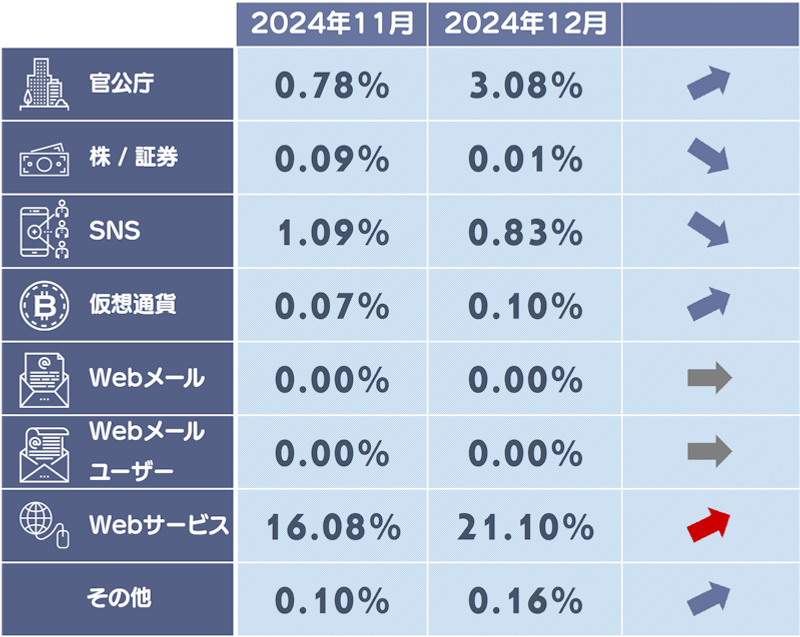 また、えきねっとやETC利用照会サービスといった交通系のフィッシングサイトが増加しており、ETC利用照会サービスは5倍以上増加しています。メール等でバラまかれており、ログイン情報を詐取する手口です。昨年も同様の傾向が見られ、年末年始の移動需要を狙った可能性もあります。