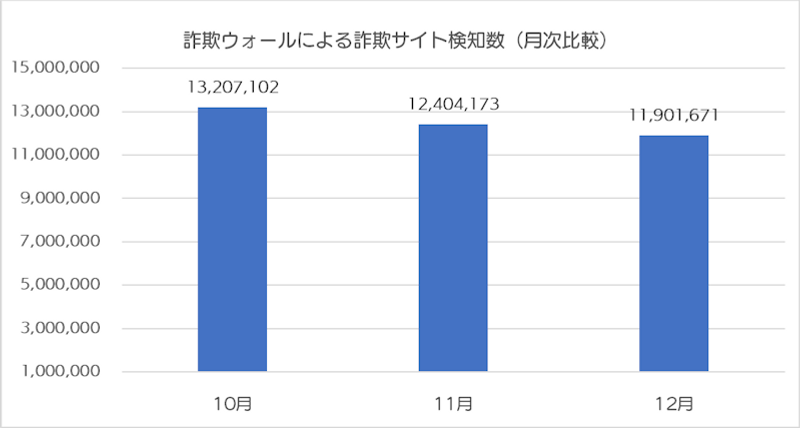 2024年12月の詐欺ウォールによる詐欺サイト検知数は11,901,671件で、2024年11月と比較すると、502,502件減少する結果となりました※。