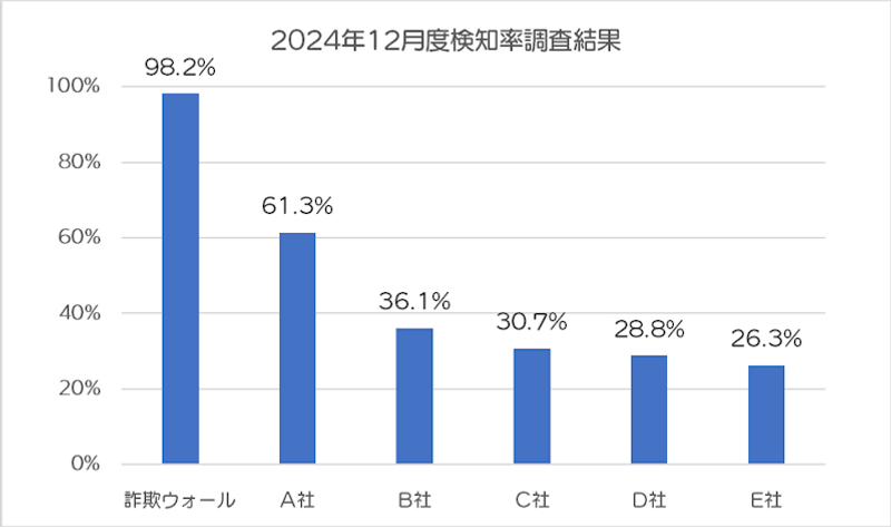 詐欺ウォールを開発・提供するBBSSでは、公的機関などとの連携によって収集した詐欺サイトURLを利用し、定期的に詐欺サイトの検知率調査を行っています。2024年12月の詐欺ウォールによる詐欺サイト検知率は98.2%と他社と比較し高い結果となりました。