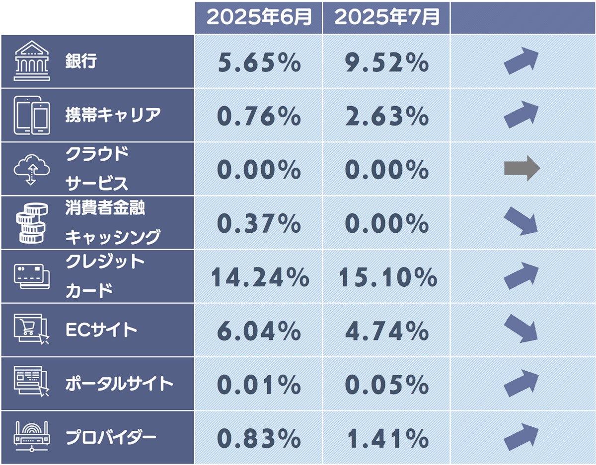 7月度のネット詐欺レポートでは、証券系サービスを装うフィッシング攻撃が一層深刻化していることが明らかになりました。SBI証券が引き続き首位を占める中、野村證券へのフィッシングサイトが前月比5倍と急増しました。さらにマネックス証券、SMBC日興証券も標的となっており、攻撃者が意図的に証券会社をローテーションしながら攻撃を仕掛けている状況が見て取れます。これは6月に観測された大和証券への攻撃急増と同様のパターンであり、攻撃者が各社のセキュリティ対策や利用者の警戒心を回避するため、戦略的にターゲットを切り替えていることを示唆しています。また、金融機関への攻撃は証券会社にとどまらず、JAバンクのフィッシングサイトが前月比3倍以上に急増するなど、地域金融機関にも拡大しています。もはや「大手だけが狙われる」といった認識は通用せず、あらゆる金融サービスの利用者が攻撃の標的となり得るのが現状です。引き続きの警戒が必要です。
