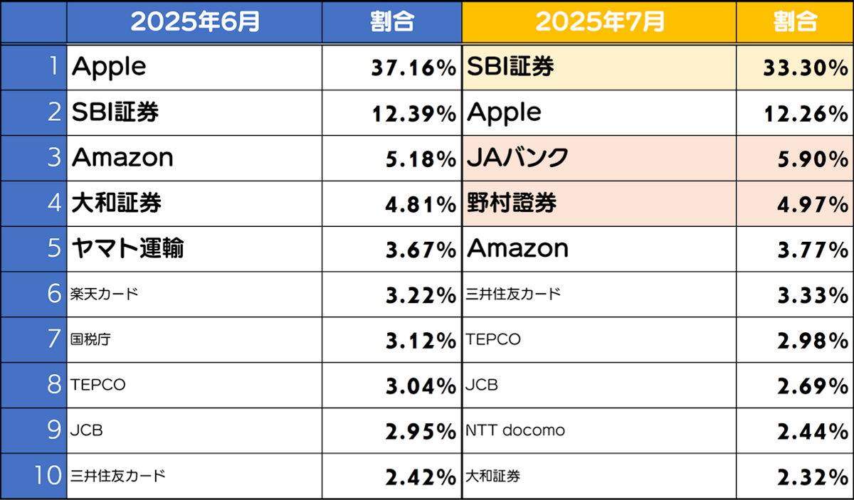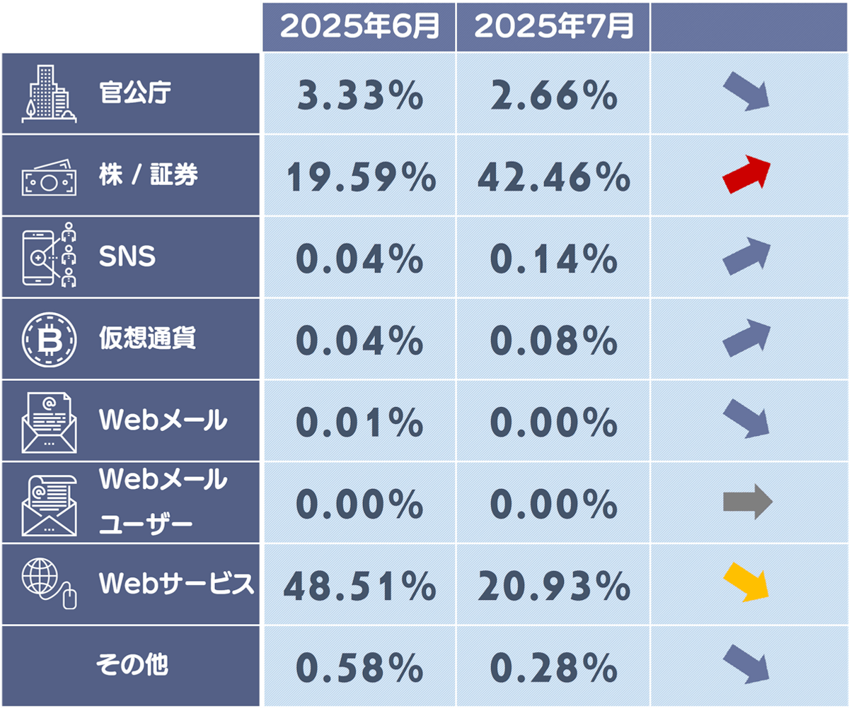 7月度は証券系カテゴリの構成比が20ポイント以上増加、実数においても60%以上増加しています。SBI証券のフィッシングサイトが2倍以上増加したことが要因となります。WebサービスカテゴリはAppleの収集数が減少したことにより構成比が減少しています。また銀行カテゴリはJAバンクのフィッシングサイトが3倍以上増加しており構成比が上がっています。