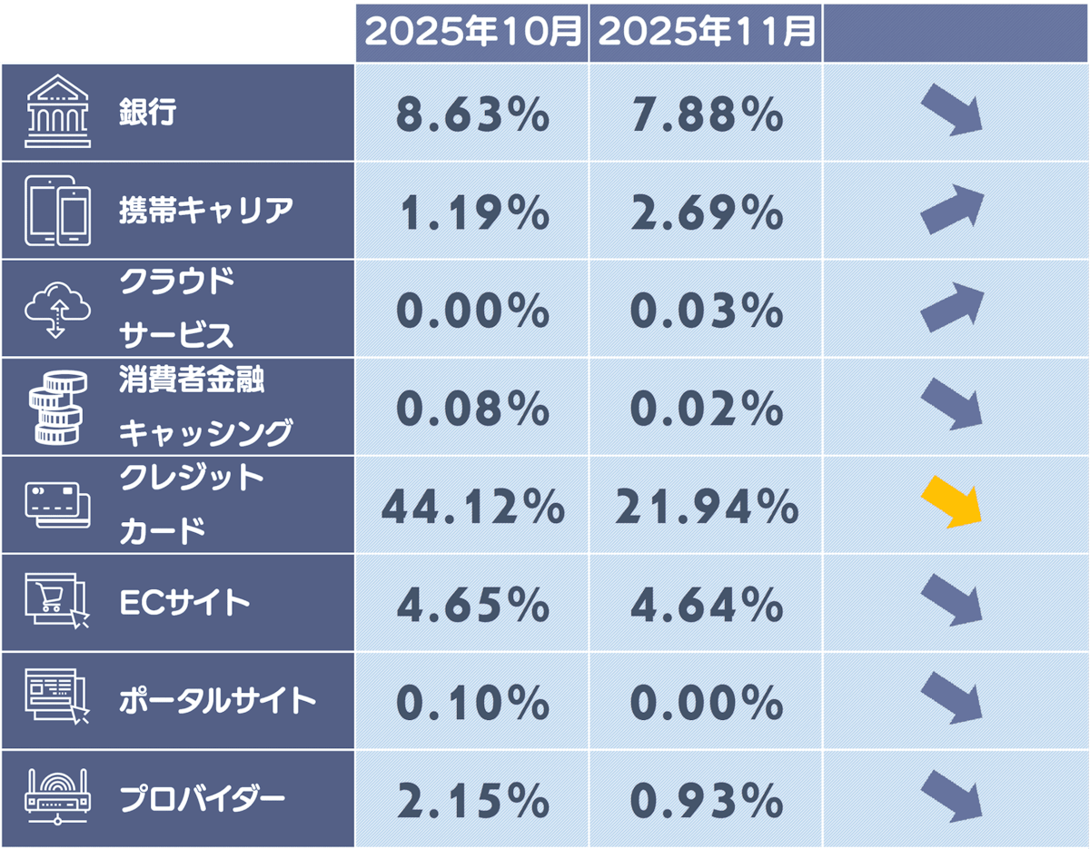 11月度は、マネックス証券のフィッシングサイトが前月に続き増加傾向を示しました。2024年4月以降、証券会社を標的としたフィッシング攻撃では、狙われるブランドが月ごとに切り替わる「ローテーション」の傾向が続いており、どの証券会社が次の標的となるか予測が困難な状況です。11月度はVpass、UCカード、Oricoといったクレジットカード系ブランドが新たにランクインしており、攻撃対象の多様化が顕著に見られます。さらに、これまで大手銀行や地方銀行が主な標的でしたが、全国信用金庫協会や全国労働金庫協会など金庫系金融機関へとターゲットが移行しつつある点も注目すべき変化です。これらの事実は、特定のブランドのみが標的になるわけではなく、どのようなブランドも標的になり得ることを示唆するものであり、いつでも身に降りかかる可能性があるものとして幅広い警戒が必要です。