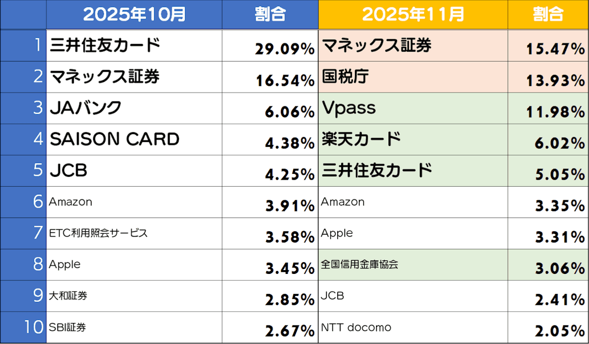 11月度は、マネックス証券が1位となりました。また、クレジットカード系のブランドも複数ランクインしています。